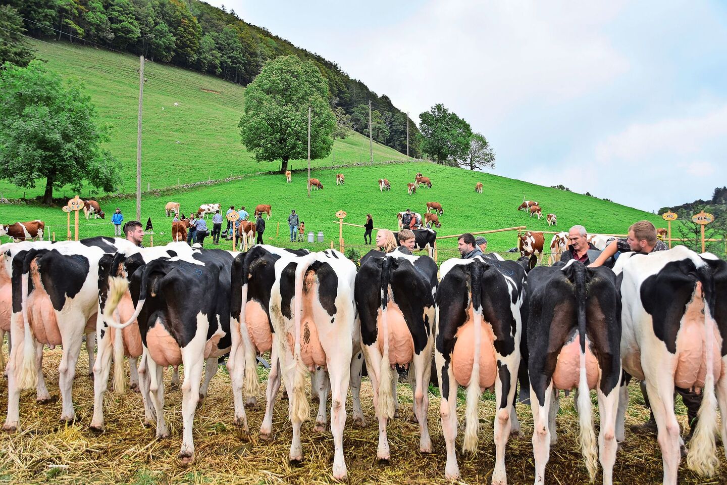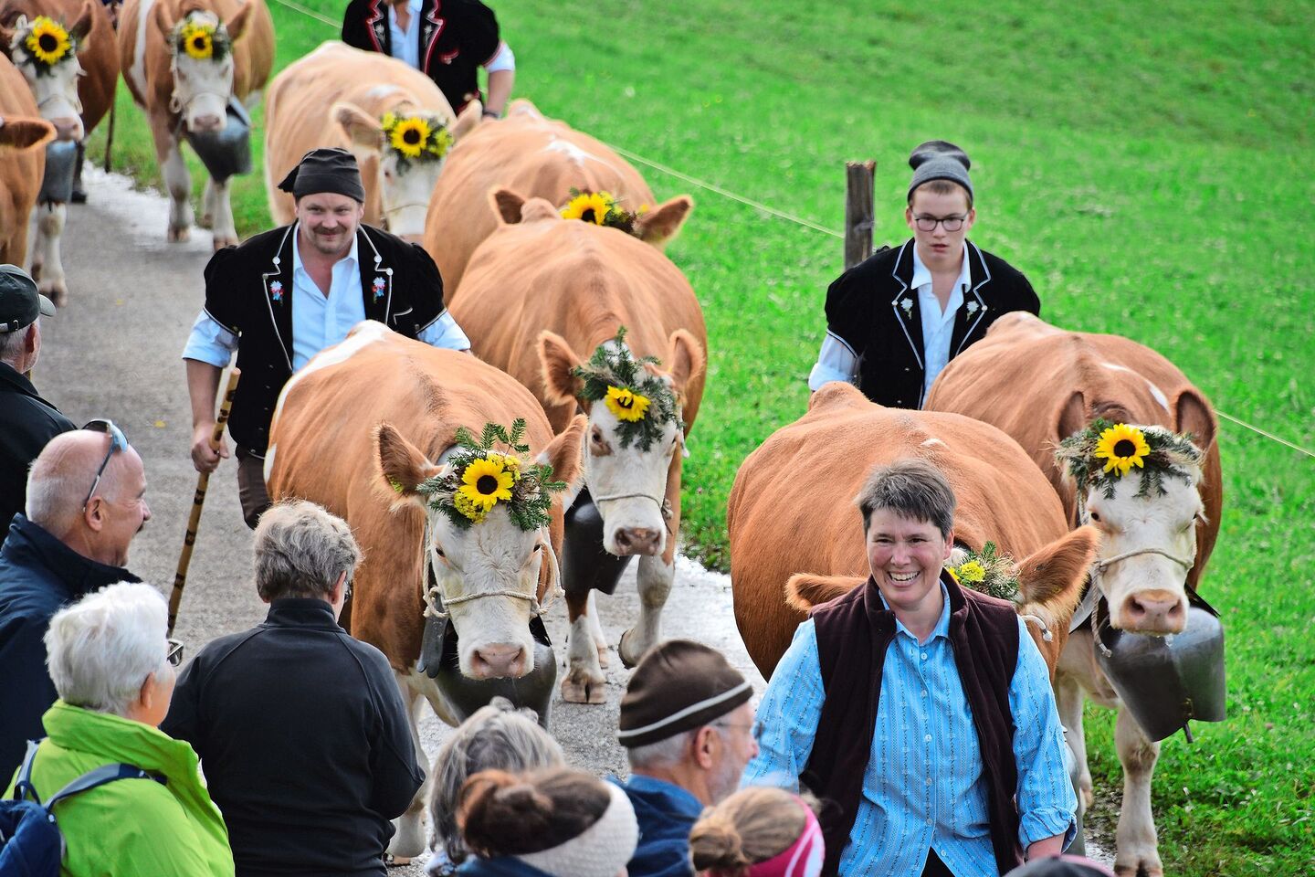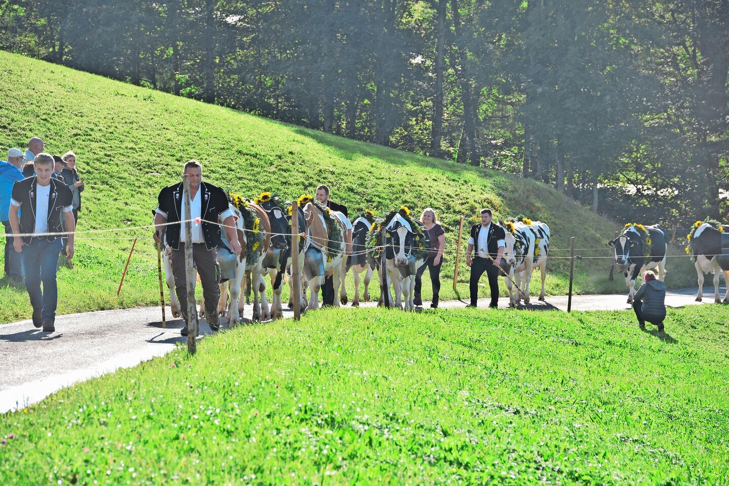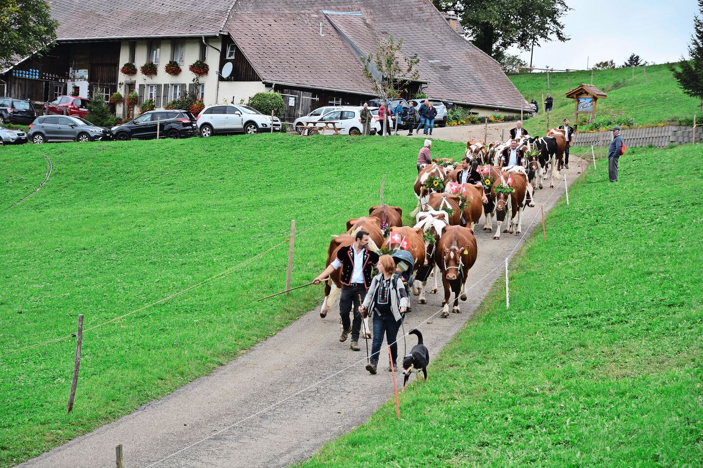 Auch am Mittwoch, 2. Oktober, liessen es sich die Züchterinnen und Züchter vom VZV-Passwang nicht nehmen, den vielen Zuschauerinnen und Zuschauern einen unvergesslichen Tag zu bieten. Dieser fing schon an, als die fünf Betriebe ihre Kühe mit einer «Zügleten» auf den Schauplatz, auf den mittleren Passwang, zum Betrieb der Familie Paul Lisser trieben. Obwohl die Familie Lisser ihre Tiere nur aus dem Stall an die Latten hätte binden können, machte auch sie am Morgen einen Umweg, um mit ihren Kühen einen eindrücklichen Alpaufzug zu zelebrieren.