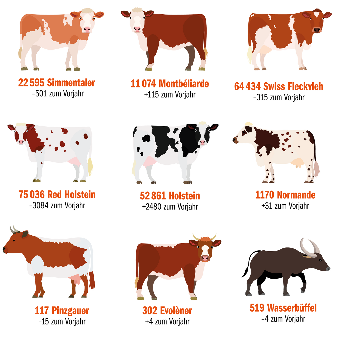 Eine Tendenz, die sich ebenfalls abzeichnet, ist, dass Rassen mit höheren Leistungen, wie Holstein und Red Holstein, tendenziell in grösseren Strukturen gehalten werden. «Das eine schliesst das andere zwar nicht aus, aber diese Tendenz zeichnet sich klar ab», sagt Gerber.