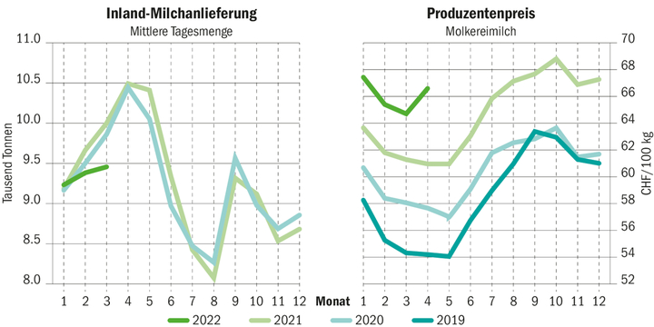 Ein Blick auf die Anzahl Milchkühe zeigt, dass der Bestand kaum abnimmt. Im April 2022 war der Milchkuhbestand lediglich ein halbes Prozent tiefer als im Vorjahresmonat. 5 % höher war die Anzahl Jungtiere zwischen 1- und 2-jährig. Diese Tiere kommen bald in Laktation. Sollte sich durch die hohen Preise im Milchviehstall tatsächlich eine Extensivierung abzeichnen, «braucht es diese Kühe, damit wir die Volumen-Milch halten können», sagt Hagenbuch.