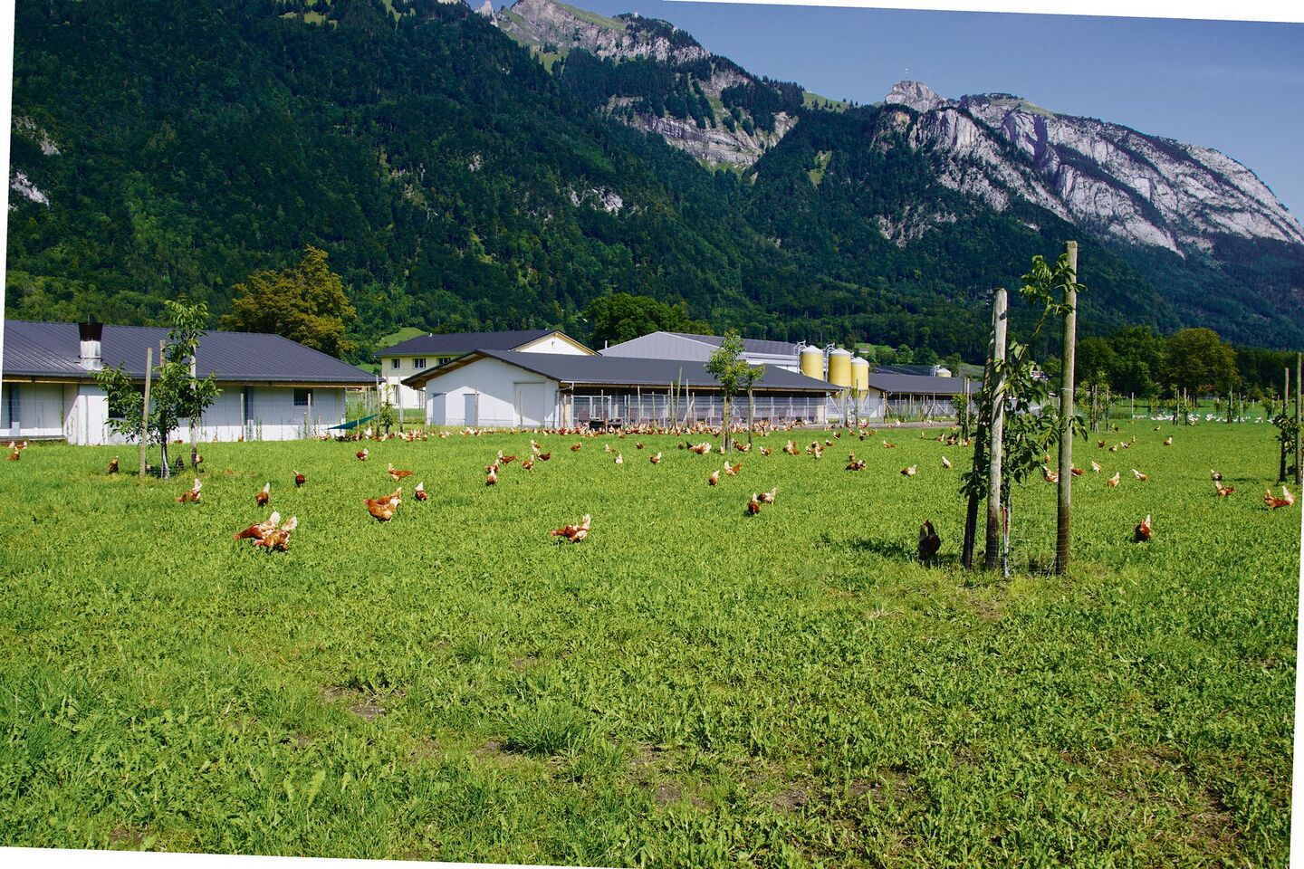 Freilandhaltung von Hühnern heisst, dass die Tiere täglich in einen Auslauf auf einer Wiese dürfen. Bio Suisse schreibt mindestens 5 m² Freilandfläche pro Henne vor. Für einen Stall mit 2000 Hennen – die maximale Einheit für Bio-Ställe – ist das ein Hektar. Die Ställe müssen über einen geschützten Aussenklimabereich, auch Wintergarten genannt, verfügen. Dort können die Hühner im Sand baden, im Stroh scharren und nach Körnern suchen, die zur Beschäftigung verstreut werden. Im Stall selbst befinden sich die Legenester sowie die Volieren, die Sitzstangen mit Fütterungseinrichtungen und Tränken.