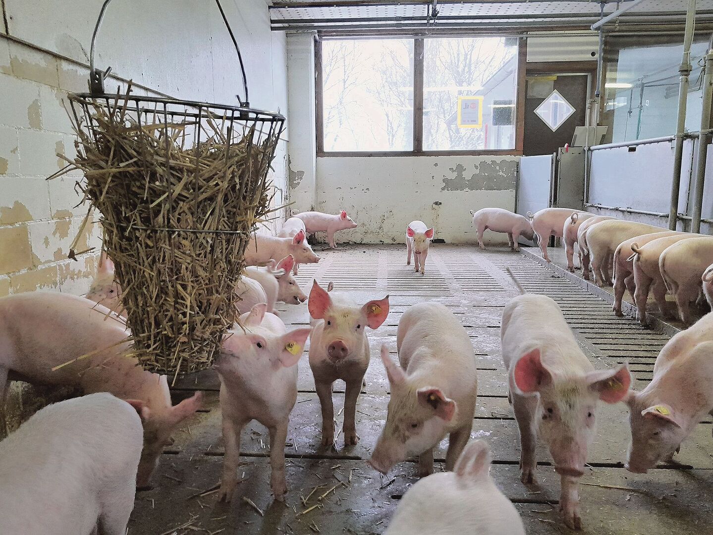 Ein Mastschwein verbringt seine Tage hauptsächlich mit Essen und Schlafen, erklärt Aaron Milz. «Es hat die Möglichkeit, sich frei zu bewegen und sich mit Strohraufen oder Strohwürfeln zu beschäftigen, um dem natürlichen Trieb gerecht zu werden.» Die Schweine leben in Gruppen von 20 Tieren in sogenannten Buchten. Haben sie das Gewicht von 60 kg erreicht, werden sie nochmals in kleinere Gruppen aufgeteilt, damit sie mehr Platz haben.