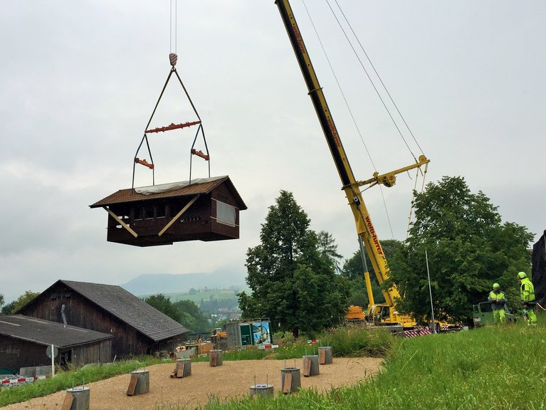 Das zwölf Tonnen schwere Gebäude wurde mittels Teleskop-Kran an seinen neuen Standort gehoben, wie das FiBL mitteilt. Der Umzug wurde nötig, weil der bisherige Platz für die 2. Bau-Etappe am FiBL mit Restaurant, Konferenz- und Bürogebäude freiwerden muss.