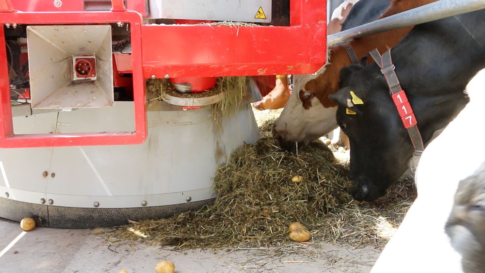In der Futterküche werden die Komponenten für verschiedene Rationen in Blöcken alle drei bis vier Tage bereitgestellt. Der Futtergreifer füllt die benötigten Mengen eines jeden Futtermittels selbständig in den Mischer, wobei er mehrmals nachgreifen kann, um jede Ration exakt abzuschliessen. Indem der Greifer fähig ist, kleine Futtermengen in den Mischer zu füllen, können auch kleine Rationen ab 50 Kilogramm für Kälber erstellt werden.