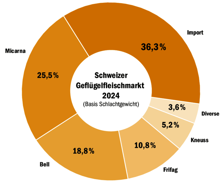 Die Zahlen der Schweizer Geflügelproduktion sind tatsächlich eindrücklich. So stieg die Geflügelfleischproduktion in den vergangenen zehn Jahren um insgesamt 41 Prozent. Alleine von 2023 bis 2024 wurde im Inland wiederum 4,8 % mehr Geflügelfleisch produziert. Dennoch ist der Inlandanteil gesunken. Die Produktion kommt der wachsenden Nachfrage nicht hinterher. So wurden im vergangenen Jahr laut Statistik von Proviande in der Schweiz 91 983 Tonnen Geflügelfleisch produziert. Hinzu kamen Importe von 54 836 Tonnen, das sind 15,5 % mehr als im Vorjahr. Insgesamt standen der Schweizer Bevölkerung damit im vergangenen Jahr 144 398 Tonnen Geflügel zur Verfügung. Der Inlandanteil sank um gut zwei Prozent auf noch 63,7 %.