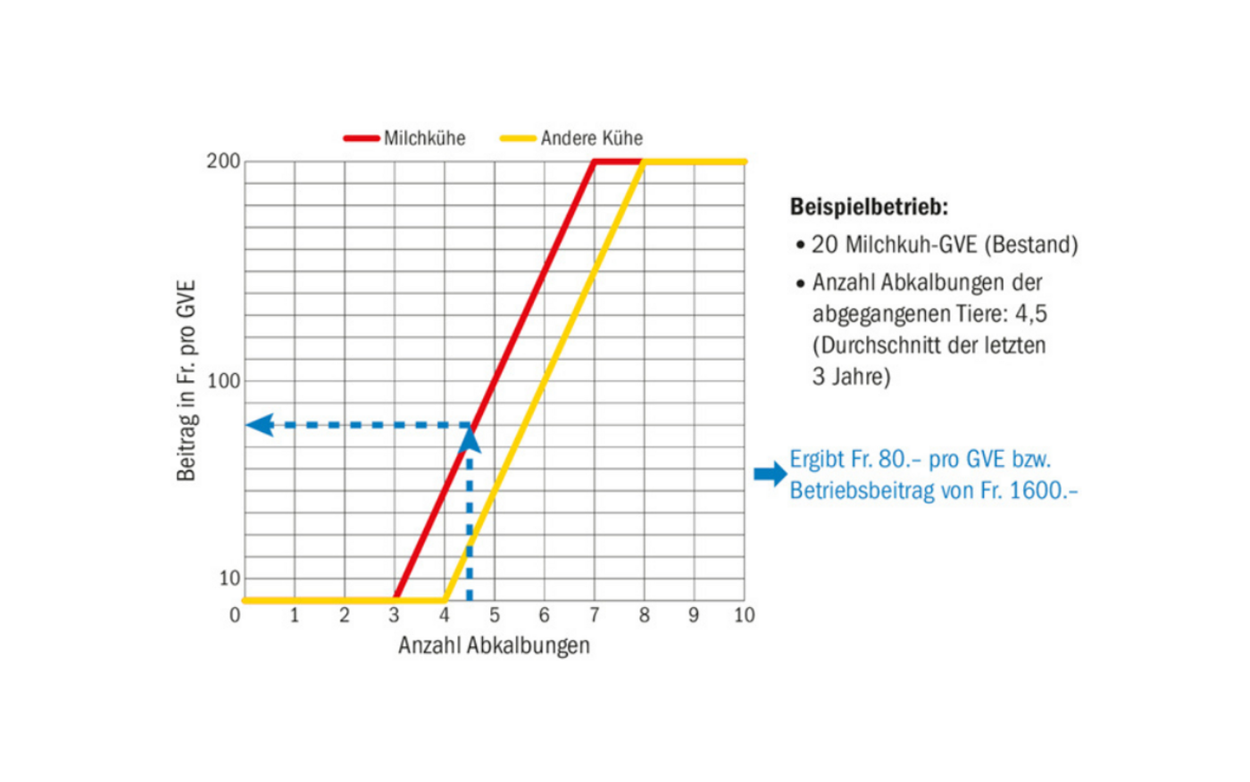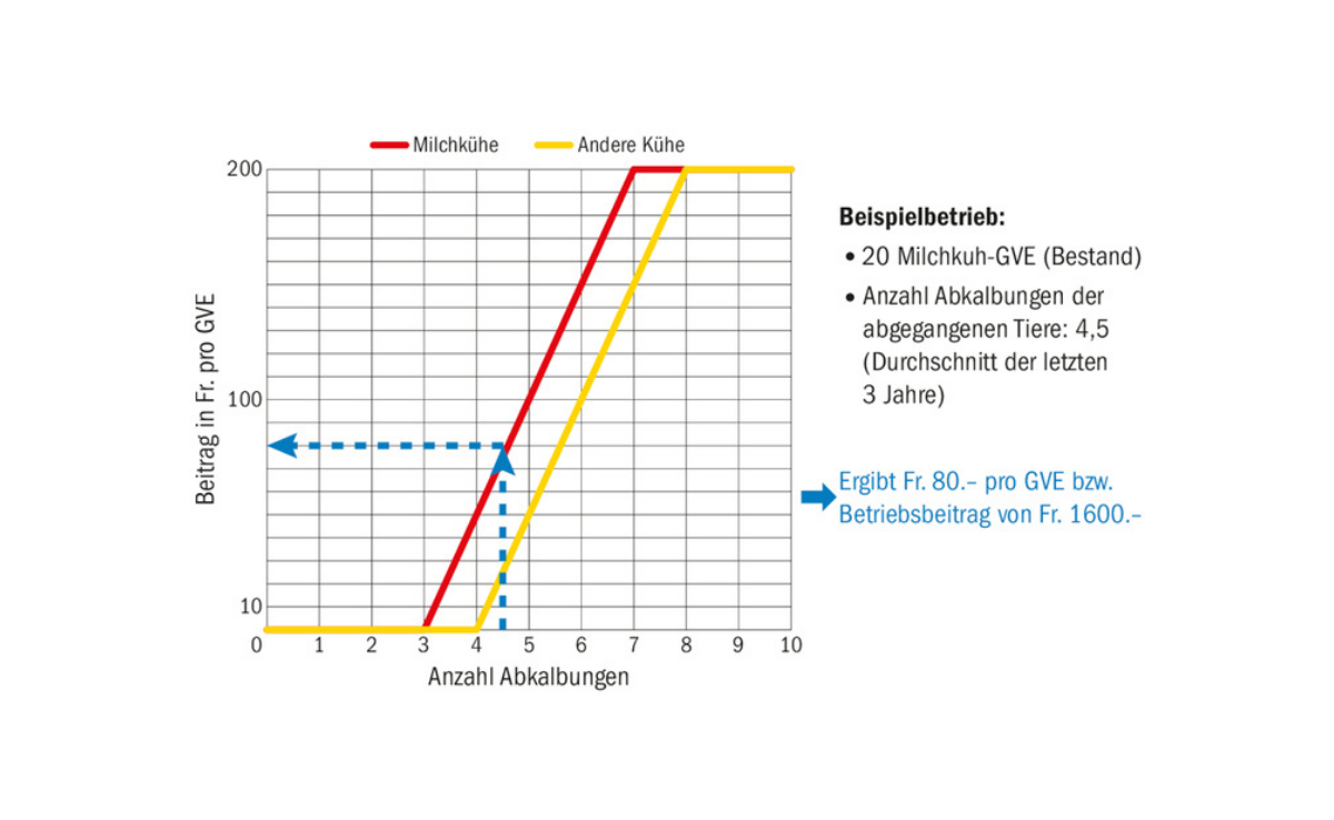 Multipliziert man diese Beiträge mit dem Viehbestand (GVE), resultiert daraus ein sogenannter Betriebsbeitrag. Für andere Kühe, wie zum Beispiel die bei der Mutterkuhhaltung, gilt der gleiche Zahlungsrahmen, allerdings ist hier der Beitrag erst ab der vierten Abkalbung festgelegt, und die 200 Franken pro GVE gibt es erst ab der achten Abkalbung.