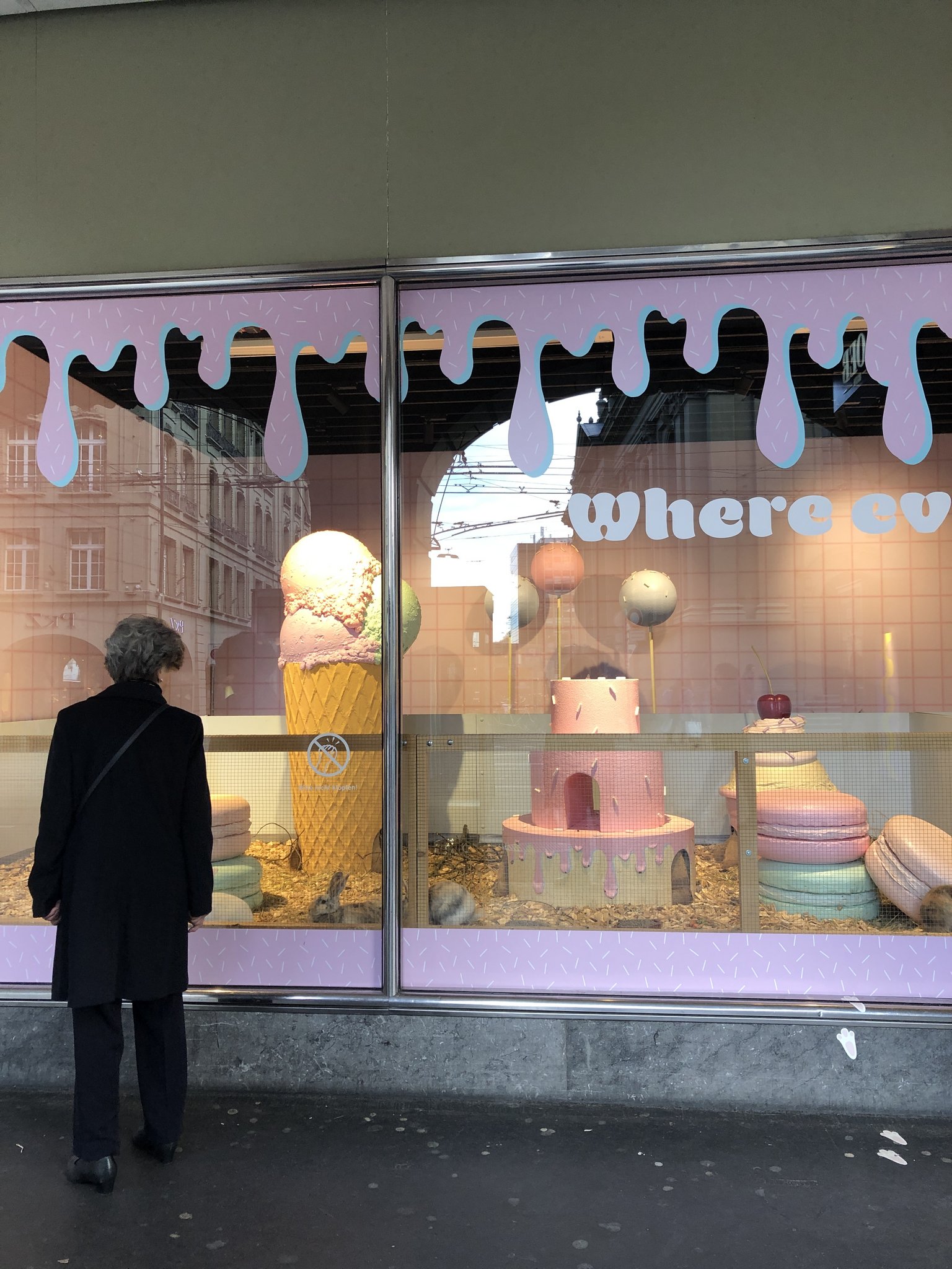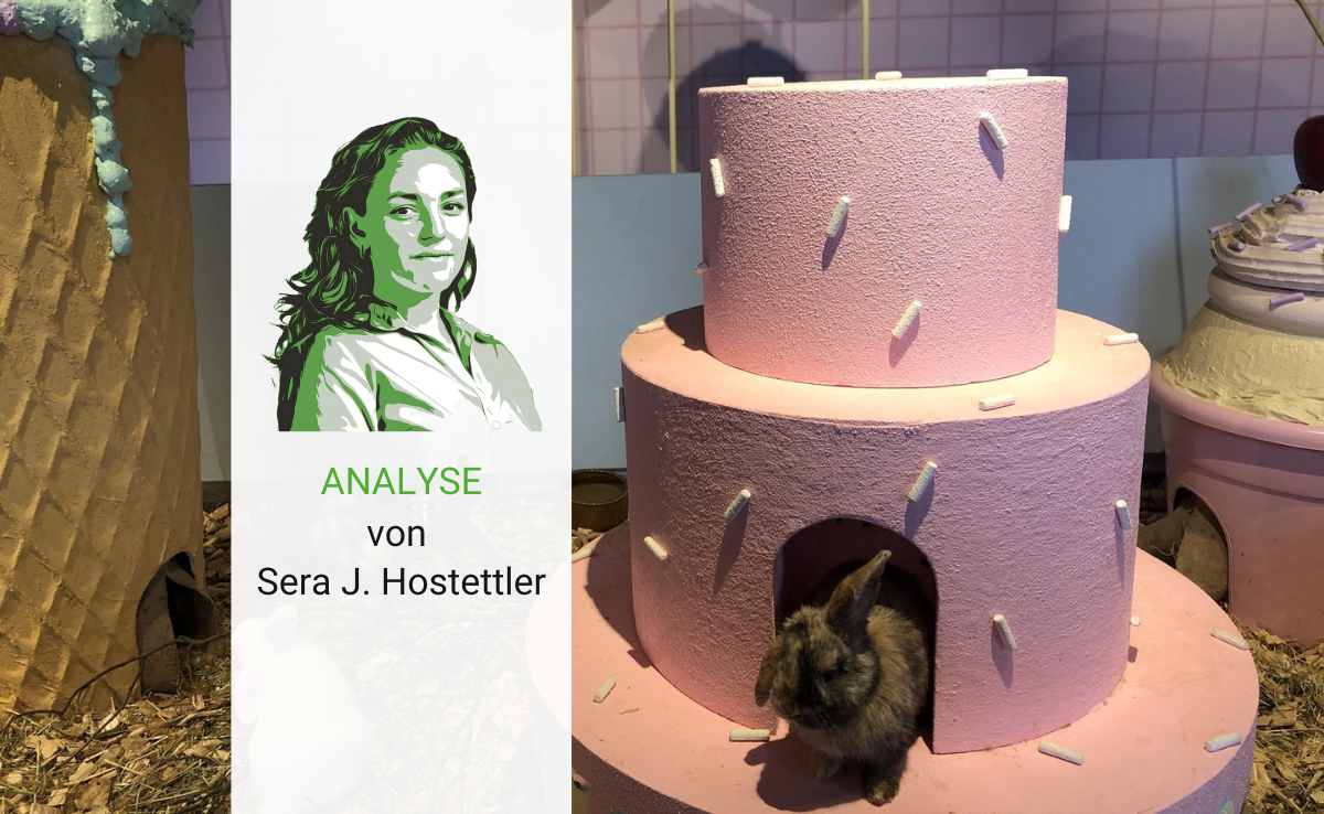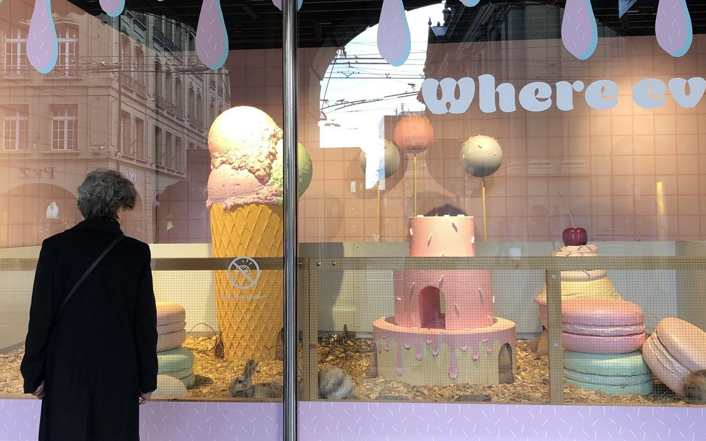Ich verstehe nicht viel von Kaninchen, aber ich bin überzeugt: Überdimensionale rosa Plastik-Eiscrèmecornets und lila Streuseltorten entsprechen nicht unbedingt dem bevorzugten Habitat dieser Nager – auch wenn die Module gemäss dem Schaufensterverantwortlichen vom Bundesamt für Lebensmittelsicherheit und Veterinärwesen geprüft worden sind.