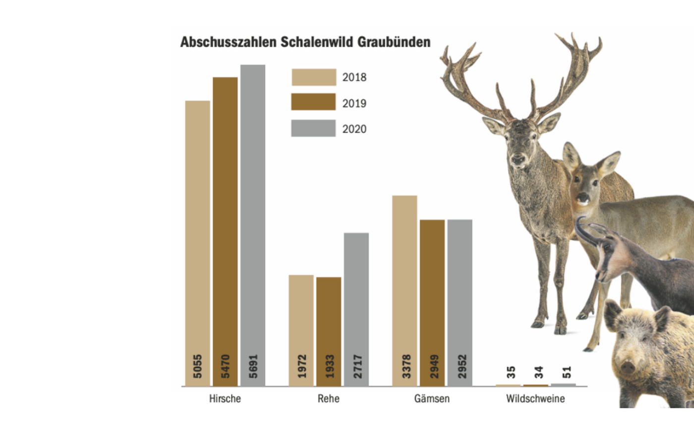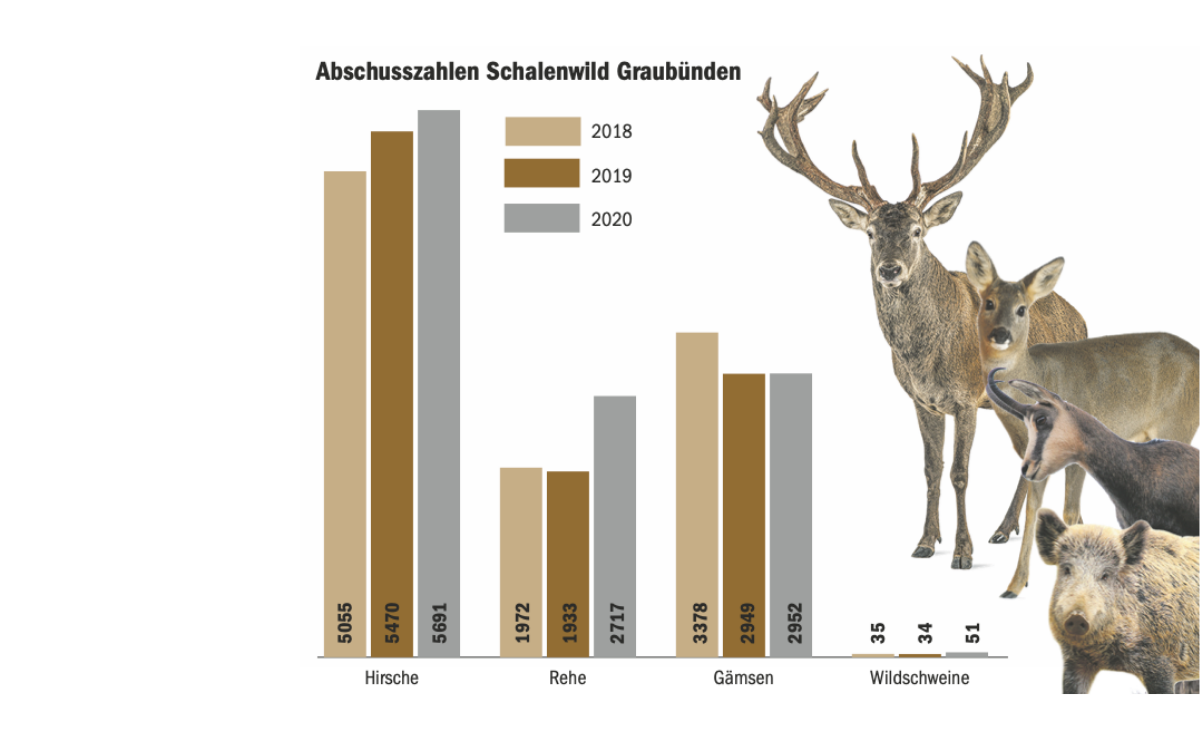 Neben den hohen Reh- und Hirschbeständen, regional auch Gämsbestände, werden Wildschweine im Kanton vermehrt zum Problem. «Besonders im Misox verursacht die Wildschweinpopulation zunehmend grosse Schäden in landwirtschaftlichen Kulturen», weiss Arquint. Hier waren die Abschusszahlen über die letzten Jahre recht stabil. 2020 waren es 51 Abschüsse, in den Vorjahren um die 34 erlegte Tiere. Dieses Jahr wurden bis jetzt 31 Wildschweine geschossen.