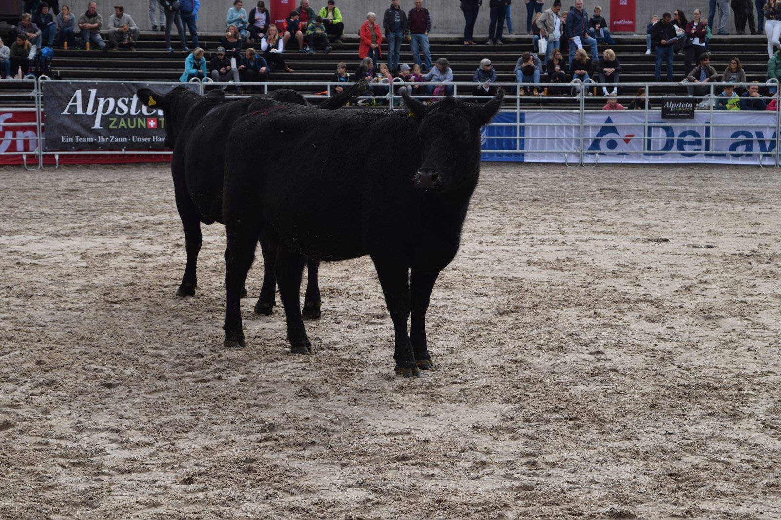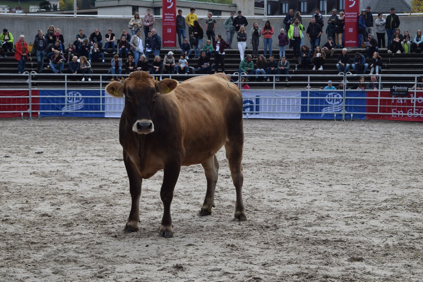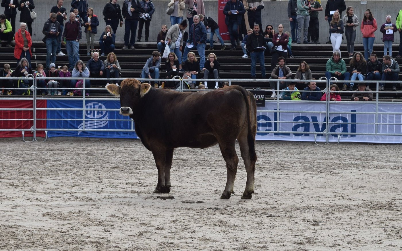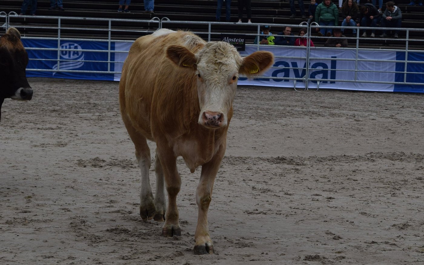 Als drittes Tier wurde OB-Kuh Azura mit ihrem Kalb in den Ring gebracht. Das Stierenkälbchen war etwas übermütig, rannte kreuz und quer durch den Ring und bahnte sich schliesslich einen Weg zwischen der Kamera und Pannels hindurch, wodurch das Stromkabel riss. «Das war’s dann mit der Live-Übertragung», kommentierte Jaquement trocken. Azura wurde nach kurzer Unterbrechung für 4'500 Franken versteigert und erzielte damit das Tageshöchstgebot. [IMG 7]