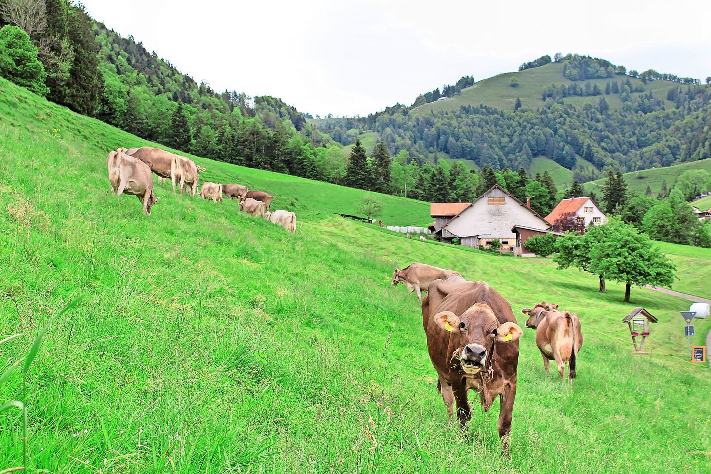 Die stattliche Brown-Swiss-Herde weidet im steilen Hang direkt neben der Scheune. Wo andere höchstens ihr Jungvieh einzäunen würden, lässt Hubert Kühne regelmässig seine Kühe weiden. Zum einen hat er nicht viele andere Möglichkeiten, zum anderen trainieren die Vierbeiner auf diese Art und Weise bestens ihre Kondition. [IMG 3] Diese Rechnung geht auf: Im Stall des passionierten Züchters stehen mehrere Braune mit mehr als 100'000 kg Milch Lebensleistung. Zu Recht ist der 44-Jährige stolz auf seine Kühe. Doch eine andere Rechnung geht nicht auf – und dessen ist sich Hubert Kühne voll bewusst: «So, wie ich meinen Betrieb führe, ist er nicht wirtschaftlich. Meine Brown Swiss und die Schauen sind meine teuren Hobbys.»