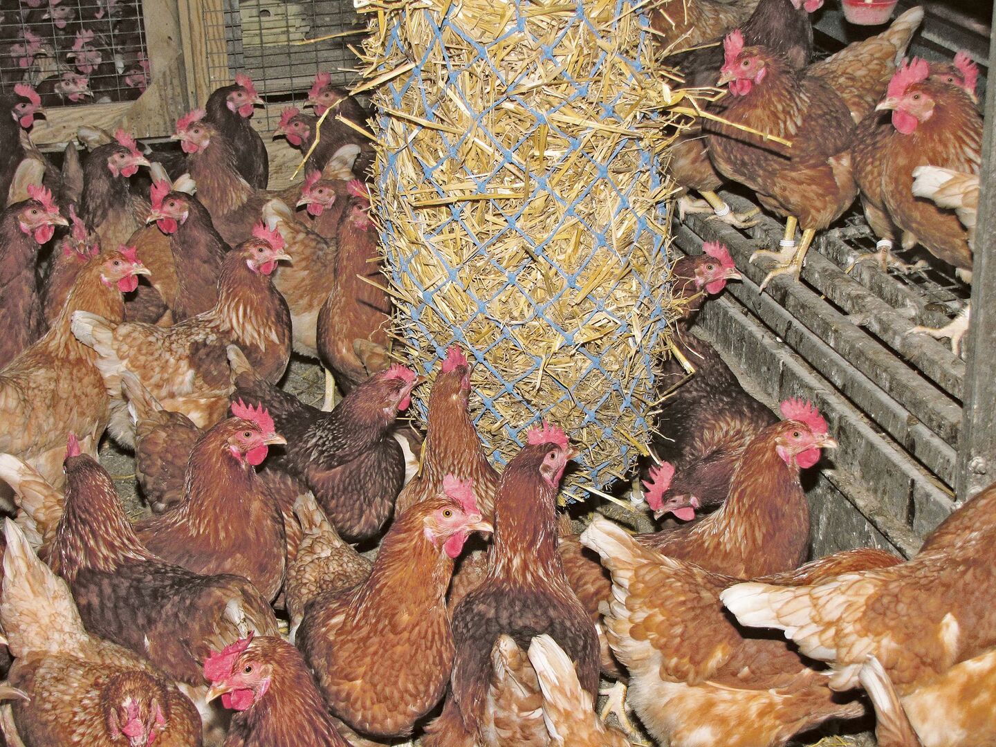 Wenn vermehrt Probleme mit gegenseitigem Bepicken auftreten, sind unbedingt die Beschäftigungsmaterialien zu erneuern bzw. aufzufüllen, oder noch besser neue, zusätzliche Materialien anzubieten. Auch bei den Hühnern weckt Abwechslung das Interesse. Geeignete Materialien sind Strohballen, Heuraufen, Sand in einem Holzrahmen, Picksteine, Körner, Rüben usw. Auch die Zugabe frischer Einstreu animiert die Hennen, sich vermehrt mit und in der Einstreu zu beschäftigen (Picken, Scharren, Staubbaden). Verkrustete Einstreubereiche sind regelmässig mit einem Rechen aufzulockern oder zu erneuern.