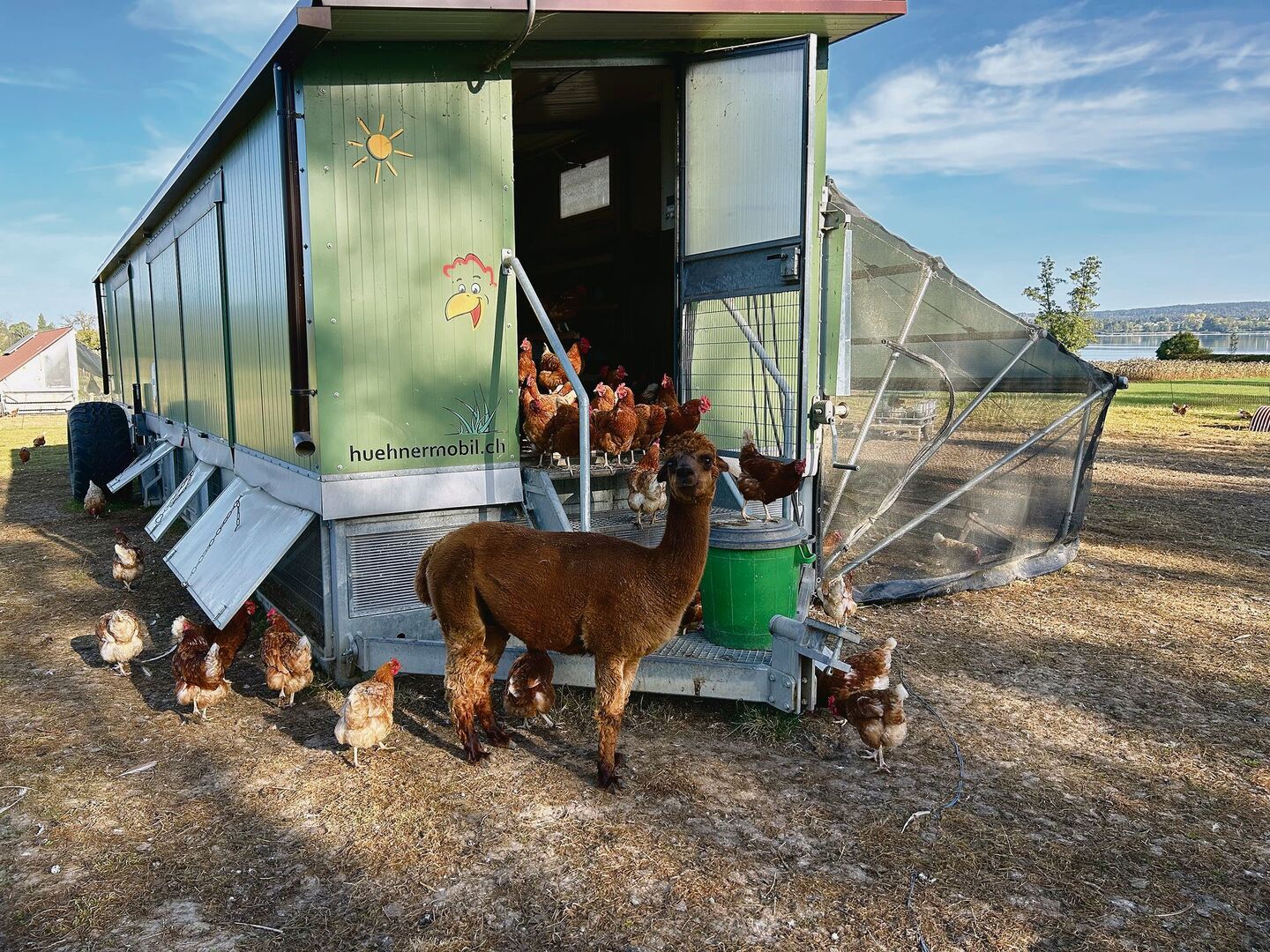 «Das sind meine Wächter», sagt Stefan Zollinger und zeigt auf die Alpakas. «Gennaro und Dusty halten den Fuchs beim grösseren Mobil fern und Ferro und Marlo beim kleineren.» Seit die Alpakas im Gehege seien, habe er nie mehr Probleme mit Füchsen gehabt – selbst dann, als während der langen Hitzeperiode alle Klappen Tag und Nacht offen gewesen seien. Der Aussenklimabereich ist zudem der Alpaka-Unterstand.