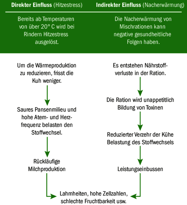 Ein Hauptproblem, das durch Hitzestress ausgelöst wird, ist die Pansenazidose. So sind bei der Fütterung Massnahmen zu treffen, welche eine Übersäuerung des Pansens verhindern. Das gelingt, wenn Ergänzungsfutter mit hoher Nährstoffdichte eingesetzt wird. «So muss weniger Ergänzungsfutter eingesetzt werden, die Nährstoffversorgung wird dennoch gedeckt, und das Risiko von Pansenazidose verringert», weiss Salzmann. Pansenpuffer würden zusätzlich das Pansenmilieu stabilisieren. «Wir haben gute Erfahrungen mit Kombiprodukten gemacht, die nebst dem Pansenpuffer hochdosierte Lebendhefen enthalten», so Salzmann. Damit würde das Pansenmilieu stabilisiert und die Grundfutterverwertung verbessert.
