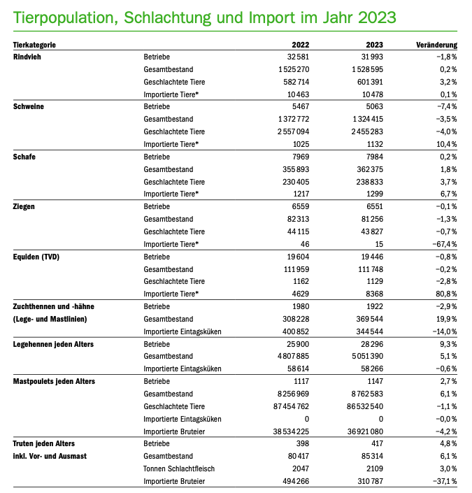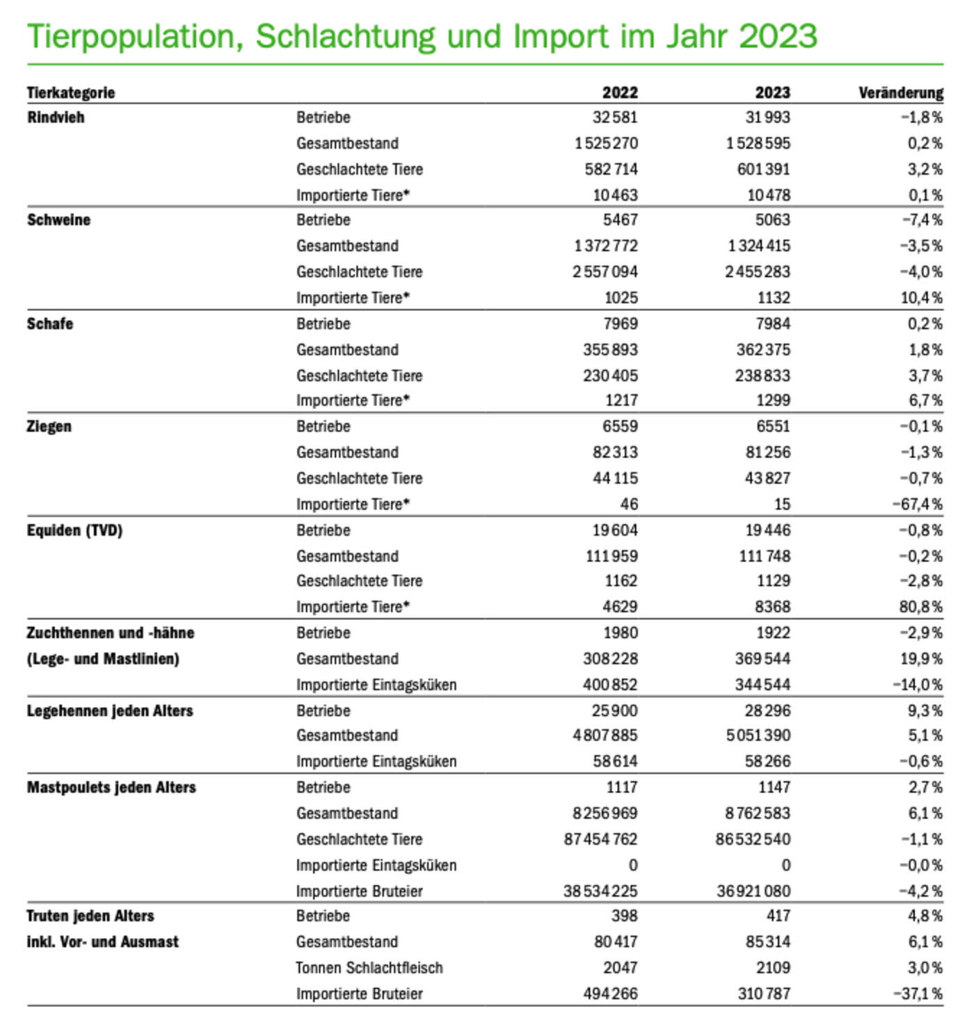 Die Anzahl der Rinder- und Schweinebetriebe nahm ab, während die Betriebe mit Schafen und Ziegen konstant blieben. Betriebe mit Nutzhühnern stiegen um 1,2 % auf 14'693. Die Importmeldungen bei Equiden nahmen um 80,8 % zu, ohne dass der Gesamtbestand stieg.