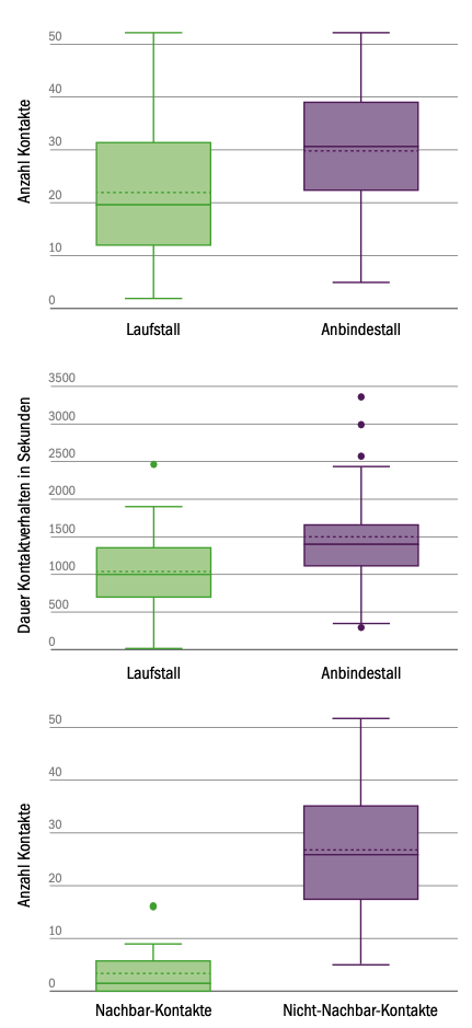Das Resultat zeigt zunächst, dass die im Laufstall gehaltenen Kühe das Kontaktverhalten seltener zeigten als ihre Artgenossinnen aus dem Anbindestall. Bei den Laufstall-Kühen wurden im Schnitt knapp 22 Kontakte festgestellt, bei jenen aus dem Anbindestall waren es rund 30.