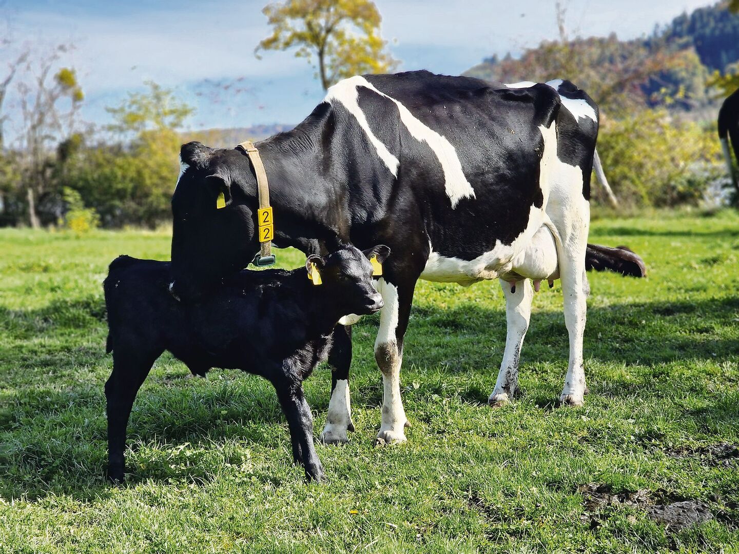 Die Herbstsonne scheint noch kräftig. Der Wohlensee ist ruhig. Auf der Weide liegen die Milchkühe der Familie Jost, dazwischen die Kälber. Was für ein ungewohnter Anblick. Direkt vor uns leckt eine kapitale Holsteinkuh ihr wenige Tage altes Kalb – sein Vater ist ein Angusstier. «Ich lasse nur noch ausgewählte Tiere gesext besamen – etwa vier- bis fünf jährlich. Der Rest trägt Mast», erklärt Lukas Jost.
