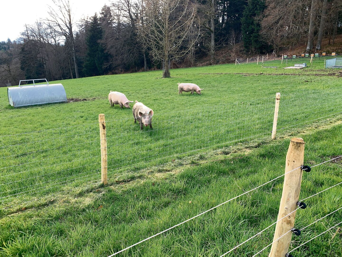 Nun sind sie eingezogen, in ein grosses Freigehege in einer Wiese und im Wald. Drei trächtige Muttersauen leben seit Mitte März auf dem Panoramahof in Meggen, Ende Mai sollen sie dort abferkeln. Ein zweites Freigehege sollen nebenan demnächst errichtet werden, damit gewechselt werden kann. Auch dort soll neben Wiese auch im Wald für die Schweine eingezäunt werden, obwohl darin mit öffentlichen Geldern kürzlich ein Jungwuchs gepflanzt wurde.