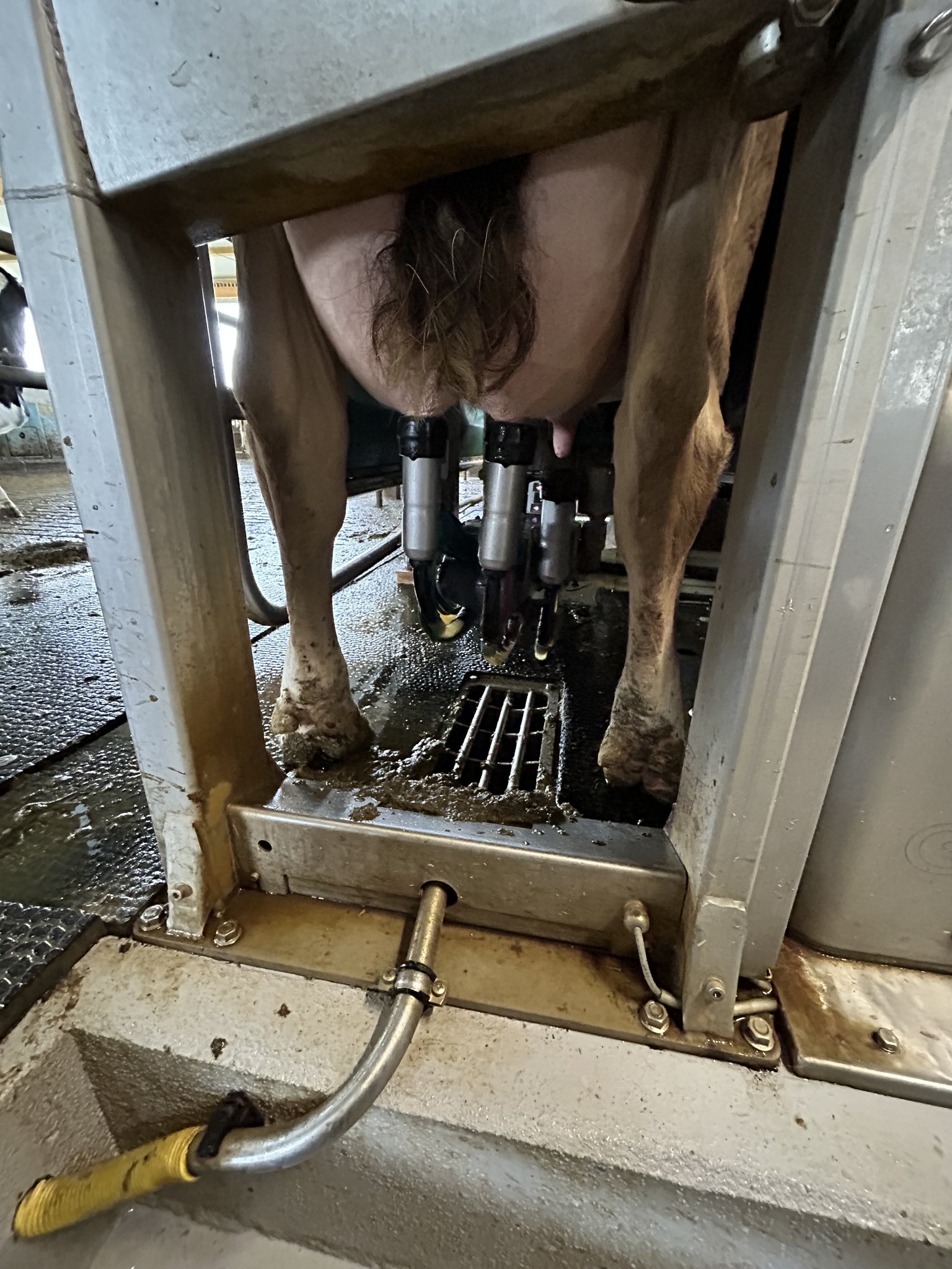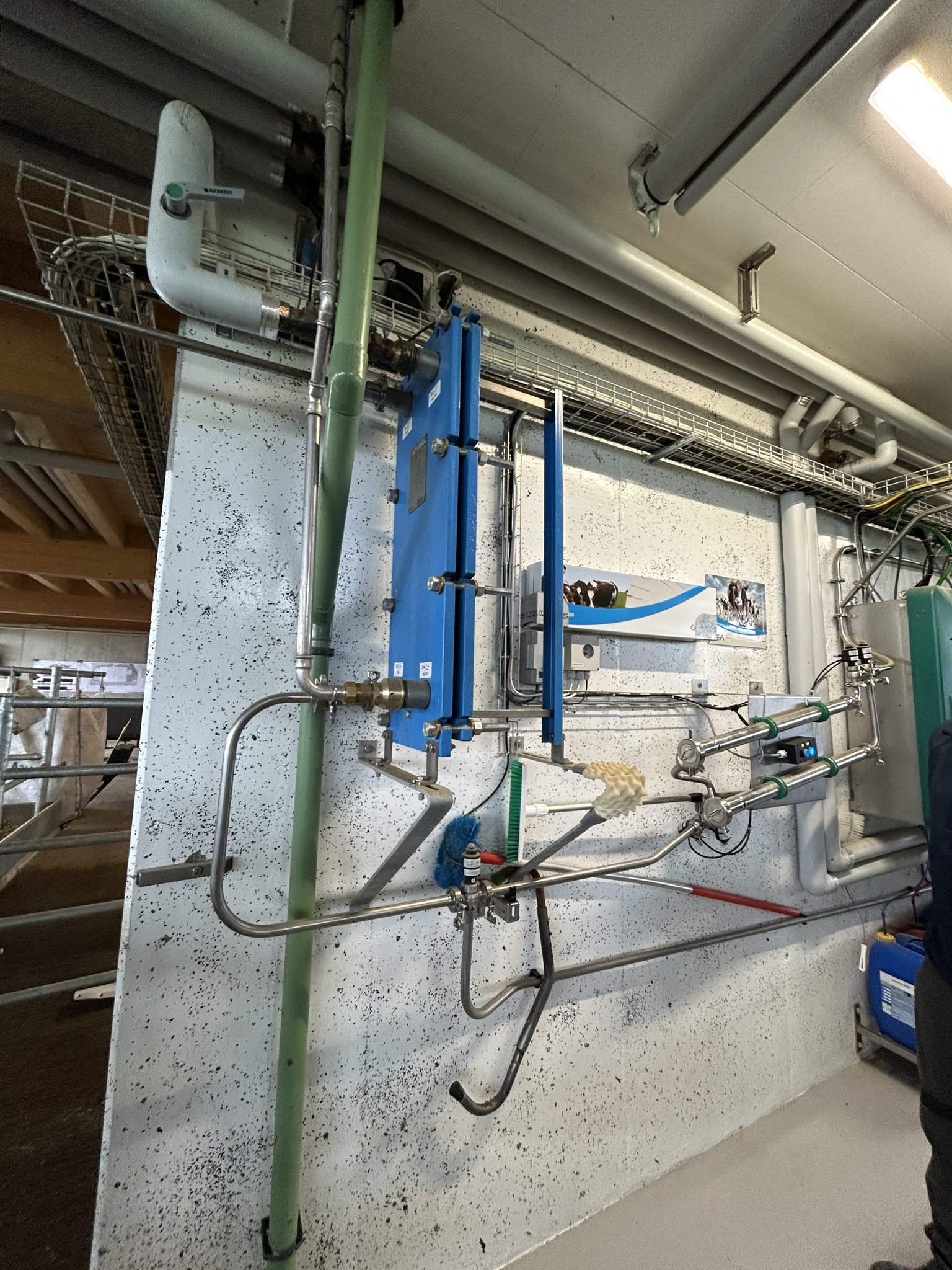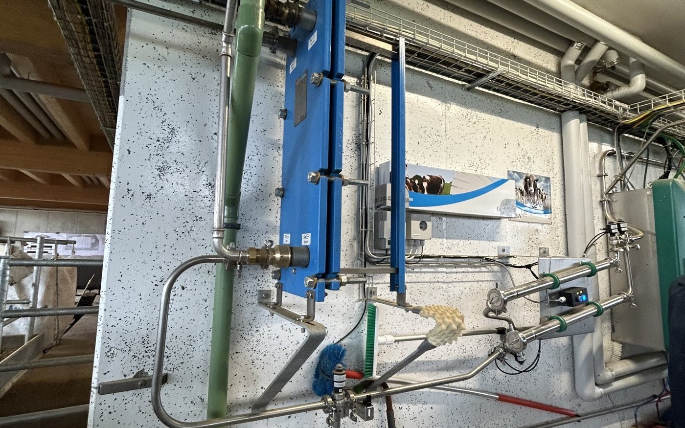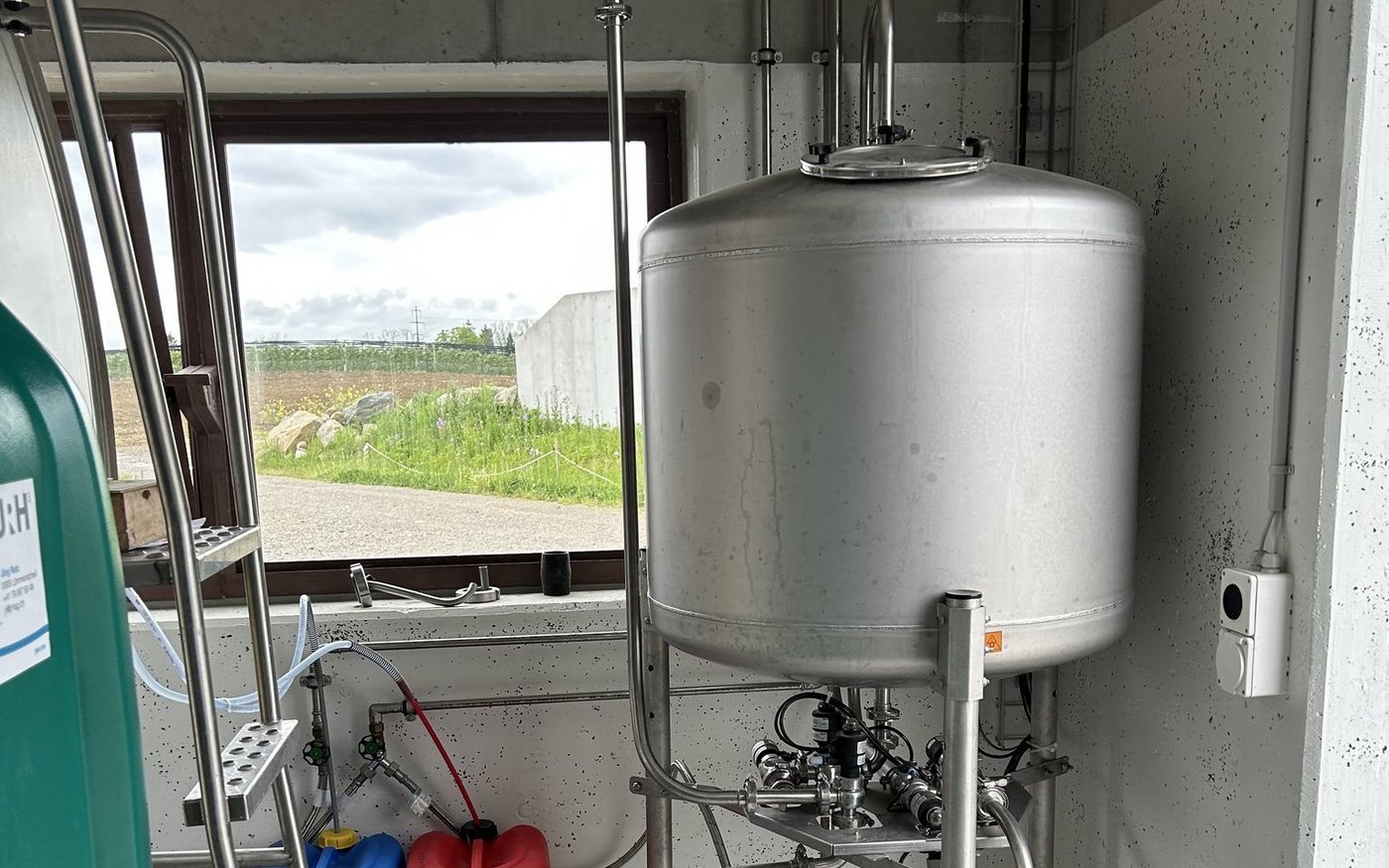 [IMG 6] Dazu kamen viele Details, die ihm zusagten, wie zum Beispiel, dass der Roboter bei jedem Viertel die Zellzahl misst. Dafür seien keine kostspieligen Reagenzien nötig. Auch könne man jedes Einzelviertelgemelk separat ableiten. «Das funktioniert wie ein Früherkennungssystem. Wir erkennen aufkommende Eutererkrankungen rasch und reagieren umgehend. Dadurch konnten wir den Antibiotikaeinsatz für Mastitisbehandlungen deutlich reduzieren», sagt Roth. Der Roboter verfügt über einen Plattenkühler für die Milch. Das erwärmte Wasser leitet Roth in die Tränketröge. Neben dem Milchtank steht ein etwas kleinerer Puffertank. So können die Kühe auch während der Milchabholung und der Tankreinigung gemolken werden.