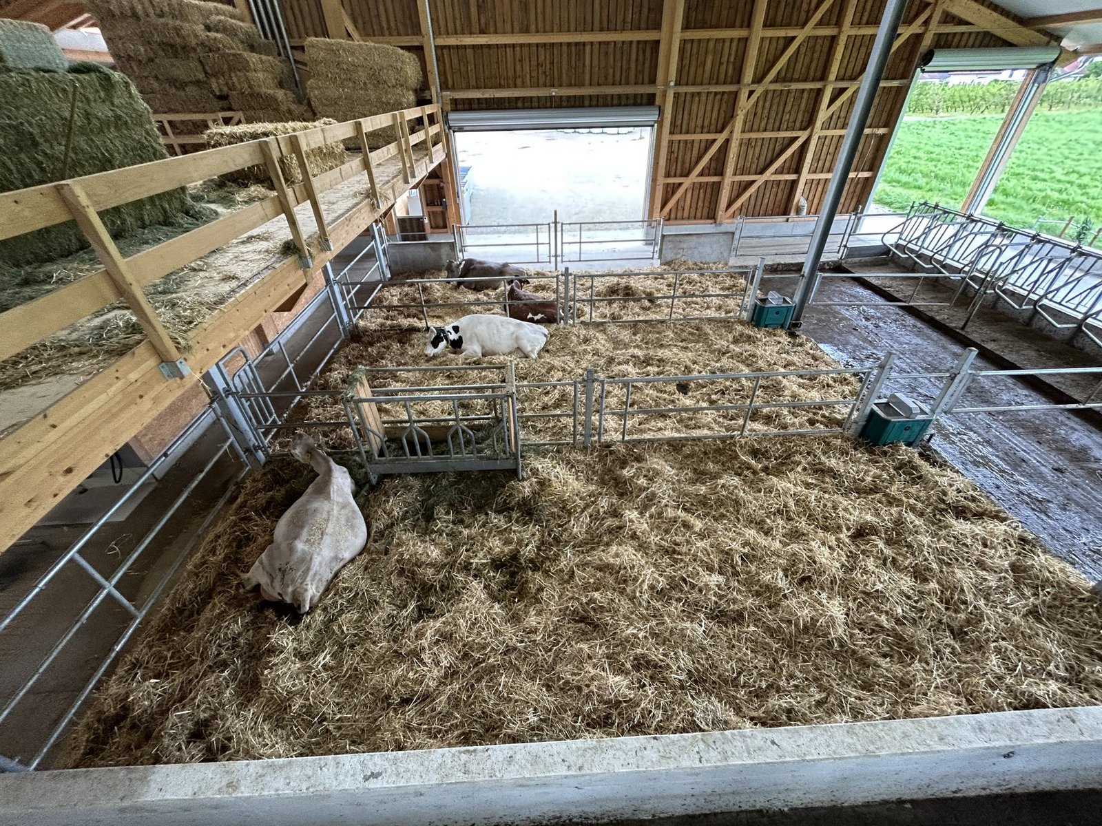 Bewährt hat sich zudem das«Guided-Exit-Konzept». Dabei wird die Kuh, wenn sie den Roboter verlässt, durch ein Selektionstor erkannt und zurück zur Herde, in die Separationsbox oder in die Tiefstreufläche geleitet. Durch die breite Bauweise hat es im vorderen Stallteil genug Platz für zwei Separationsabteile und drei Tiefstrohflächen (Transit- und Kalberkühe, Krankenbucht), ein geräumiges Büro und für einen fix installierten Klauenstand. [IMG 7]