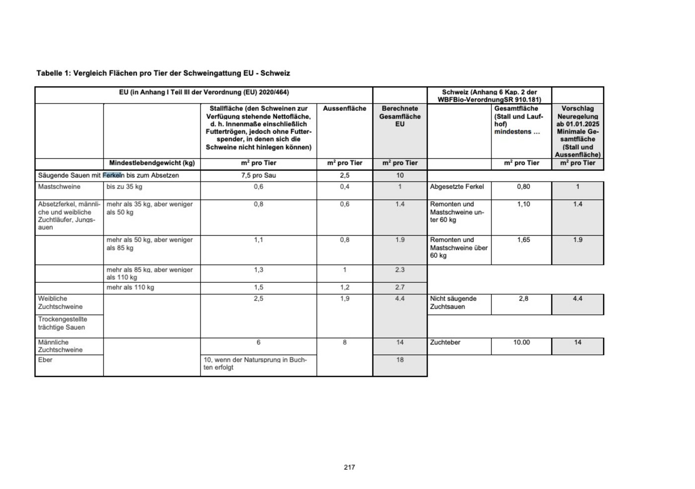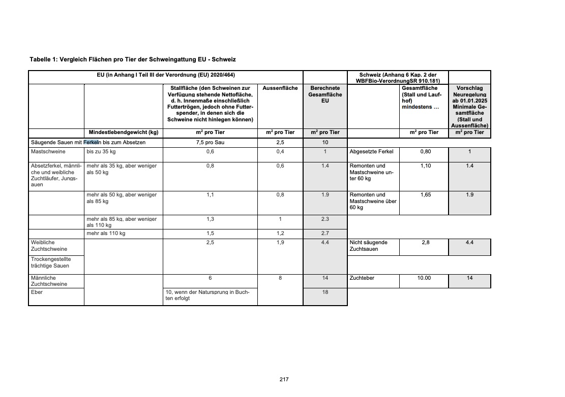 Je nach Schweinegattung wären die Flächen unterschiedlich stark betroffen. Abgesetzte Ferkel bräuchten zum Beispiel 25 % mehr Fläche, Remonten und Mastschweine unter 60 kg 27 % und über 60 kg 15 % mehr Fläche.