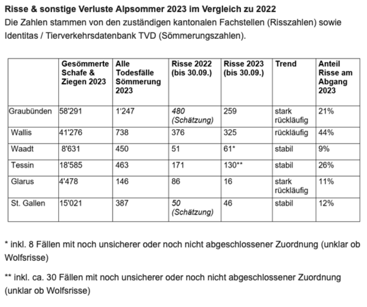 Im Vergleich zum Vorjahr seien im Kanton Graubünden fast 50 Prozent weniger Risse verzeichnet worden, heisst es weiter. Die vier Umweltverbände veröffentlicht Zahlen, die von den zuständigen kantonalen Fachstellen sowie Identitas bzw. der TVD stammen sollen. Z. T. sind die Werte als Schätzungen ausgewiesen. Bis auf Waadt, Tessin und St. Gallen, wo die Risszahlen im Vorjahresvergleich ungefähr stabil sind, zeigen die aufgeführten Kantone rückläufige (VS) oder sogar «stark rückläufige» (GL, GR) Zahlen.