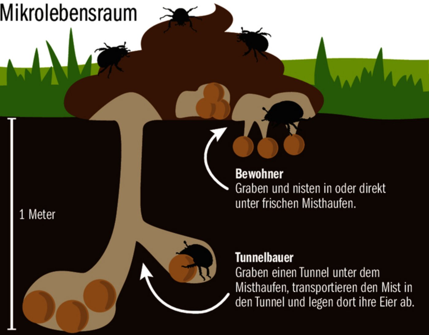 - Verbesserung der Bodendurchlüftung: Bei Mistkäfern unterscheidet man zwischen Arten, die ihre Eier in den Dunghaufen oder direkt darunter ablegen und solchen, die zu diesem Zweck Kammern oder Tunnel graben. «Einige Arten graben daumengrosse Löcher, die je nach Boden bis zu 1,5 Meter tief reichen», schildert die Insektenforscherin.