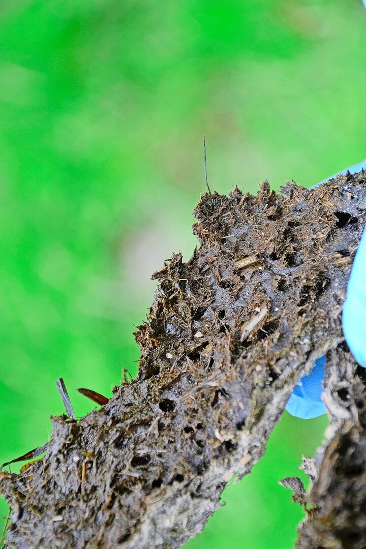 - Weniger Treibhausgase: Der schnelle Abbau des Kuhfladens durch die Mistkäfer, die darin unterwegs sind, reduziert die Dauer der Methanproduktion. Das hemmt auch den Geruch. Der Haufen wird ausgetrocknet und zerfällt in Krümel, die sich mit der Hand zu Staub zerreiben lassen.
