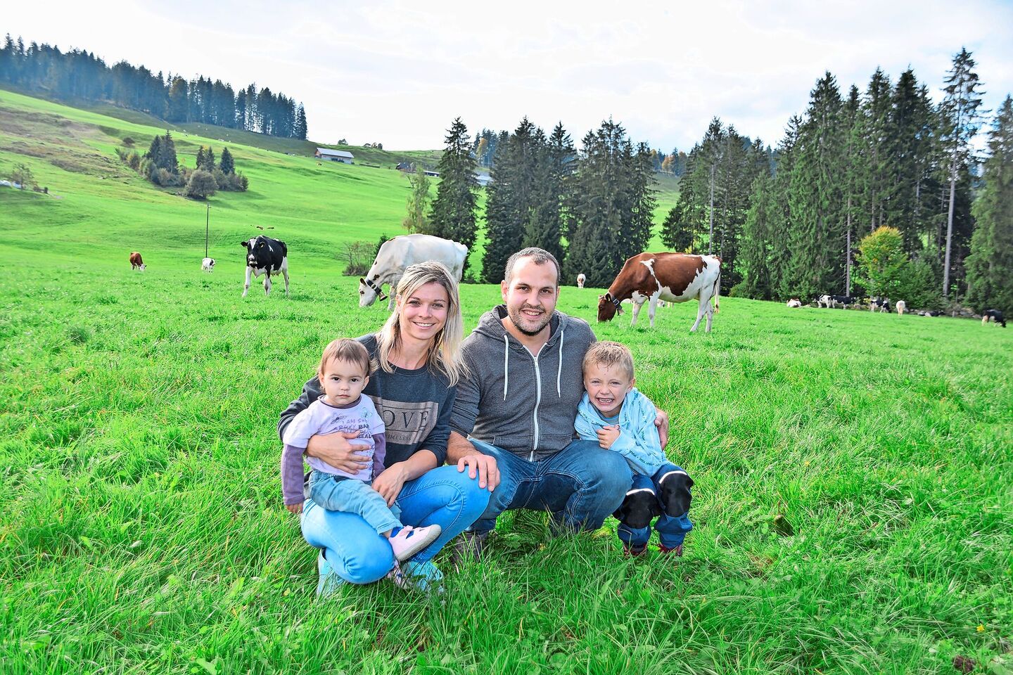 Doch Roland Salzmann kehrte der Landwirtschaft nie ganz den Rücken, erlernte vorher aber noch einen zweiten Beruf, den des Elektroinstallateurs. «Als dritten Beruf habe ich dann doch noch Landwirt gelernt», hält er lachend fest. Mit Nicole habe er jetzt auch eine Frau gefunden, die Freude an der Landwirtschaft habe. «Wir ziehen am gleichen Strick», sagen beide klar und deutlich. Zusammen mit ihrem fünfjährigen Sohn Alessio und der 18 Monate alten Tochter Sienna ist ihr Familienglück perfekt. Knapp 30 ha Land, dazu einige Hektaren Wald, 20 Kühe und das Jungvieh gilt es auf dem Längfeldhubel jahrein, jahraus zu betreuen. «Bei der Mithilfe können wir auf meine Eltern zählen», sagt der zweifache Familienvater dankend. «Meistens bin ich am Abend mit meinem Schwiegervater im Stall, melke und versorge die Kühe mit ihm», sagt Nicole Salzmann. «Da habe ich mehr Zeit für andere Arbeiten wie das Schindelnmachen», entgegnet er. Nächste Woche ist aber Teamarbeit gefragt: «Für die Jubiläumsschau werden wir die Kühe scheren. Das ist dann meine Arbeit», weiss die Bäuerin schon.
