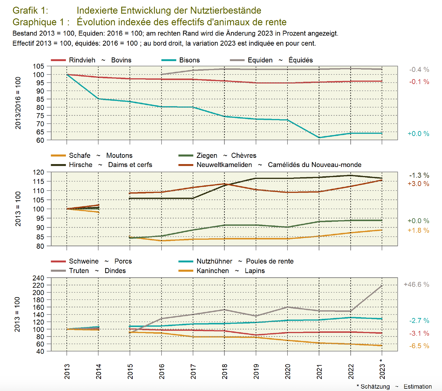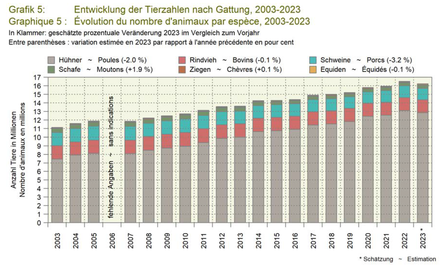 Der Schweinebestand ist 2023 zurückgegangen, was mit der Entwicklung der Produktion übereinstimmt. Inzwischen haben sich die Preise für Schlachtschweine etwas erholt, es besteht in GVE ergibt sich insgesamt eine geringe Abnahme um geschätzte 7000 Einheiten oder 0,5 %.