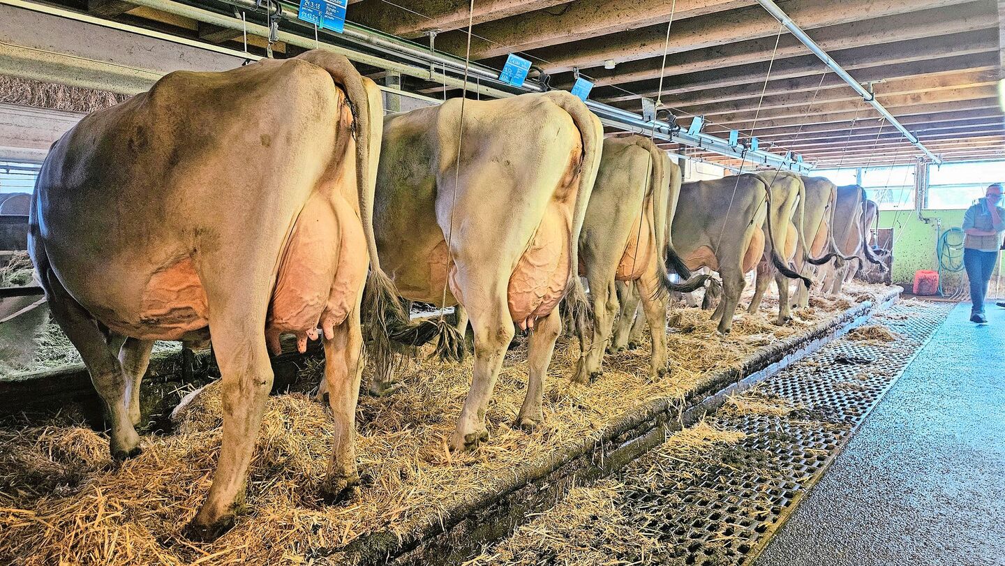 Insgesamt stehen im Stall der Familie Hobi 65 Brown-Swiss-Kühe sowie ein schwarzes Holsteinkalb. «Das gehört aber der Schwester», sagt Patrizia Hobi. Es sei ein klassischer Heubetrieb, mit Fahrsilo, Rundballen und etwas Heu.