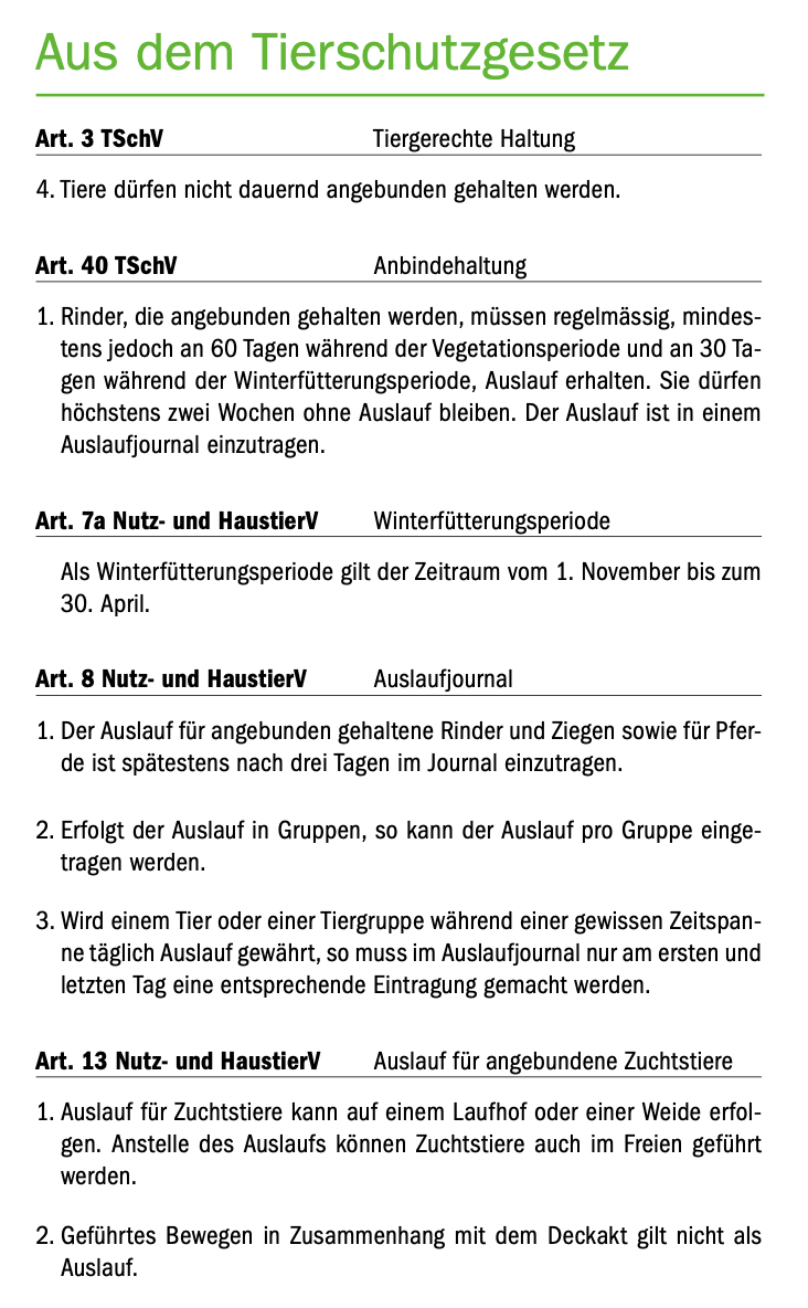 Der Winter hat die Schweiz mit voller Wucht erreicht. So schön die Bilder der Luftsprünge der Rinder im Schnee auch sein mögen, die tiefen Temperaturen, die zu Beginn dieser Woche auch im Flachland bereits im zweistelligen Minusbereich lagen, bringen Eis und Glätte mit sich. Davon sind auch die Laufhöfe betroffen. Sie sind aber für die Erfüllung des Tierschutzes wie auch des RAUS-Programms entscheidend. Vom 1. November bis zum 30. April müssen die im RAUS angemeldeten Tiere an mindestens 13 Tagen pro Monat Zugang zu einer Auslauffläche oder einer Weide haben. (Die Anforderungen an den Tierschutz entnehmen Sie der Tabelle unten.)