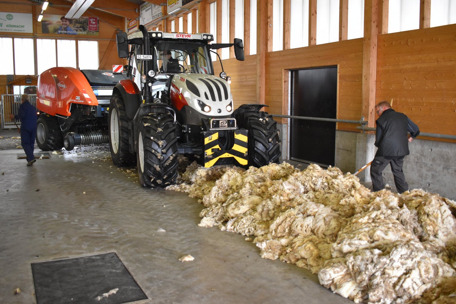 Nach dem Sortieren wurde die Ware der entsprechenden Mahd zugeführt und mit einer Siloballenpresse zu Ballen von rund 470 Kilogramm Gewicht gepresst, bereit für den Transport in die Wäscherei nach Belgien und danach zur Weiterverarbeitung nach Deutschland. Textilien, Matratzen, Wolldecken, Isolationsmaterial und schliesslich Gartendünger entstehen aus der Schafschurwolle.