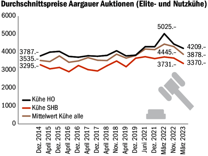 Die Aargauer Auktion hat in ihrem 25-jährigen Bestehen die volle Ladung an Marktschwankungen erlebt. So kletterte der Durchschnittspreis im April vor fünfzehn Jahren auf 4482 Franken, nachdem der Milchpreis um mehrere Rappen gestiegen war. Sechs Jahre früher, nach der BSE-Krise, krochen die Preise um 2200 Franken herum. Im Frühling dieses Jahres wurden die Kühe zwischendrin zugeschlagen, im Schnitt bei 3878 Franken.