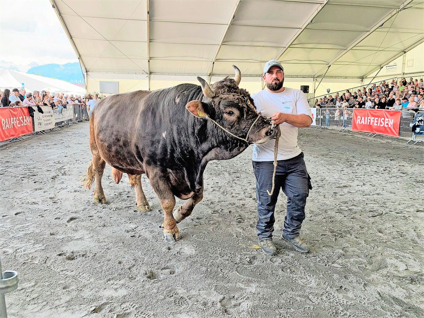 Der Original-Braunvieh-Stier Ricky ist bereits etwas herumgekommen. Geboren im November 2019 auf dem Zuchtbetrieb Honegger in Hinwil ZH, kam er als zehn Monate alter Jungstier zuerst zu Familie Bieri ins Entlebuch LU, bevor er nach Meiringen BE ins Haslital verkauft wurde. Dort war er dann während drei Jahren auf den zwei Betrieben von Simon Anderegg und Fred Winterberger für das Fruchtbarkeitsmanagement im Stall zuständig. Ricky erfüllte seine Aufgabe so überzeugend, dass die beiden Züchter von ihm am 19. April eine Halteprämie mit 57 Nachkommen präsentieren konnten. Die rahmenstarken Ricky-Töchter mit ihren hervorragenden Euteranlagen gefielen dem Luzerner Experten Sepp Portmann so sehr, dass er der Halteprämie starke 56 Punkte vergab.