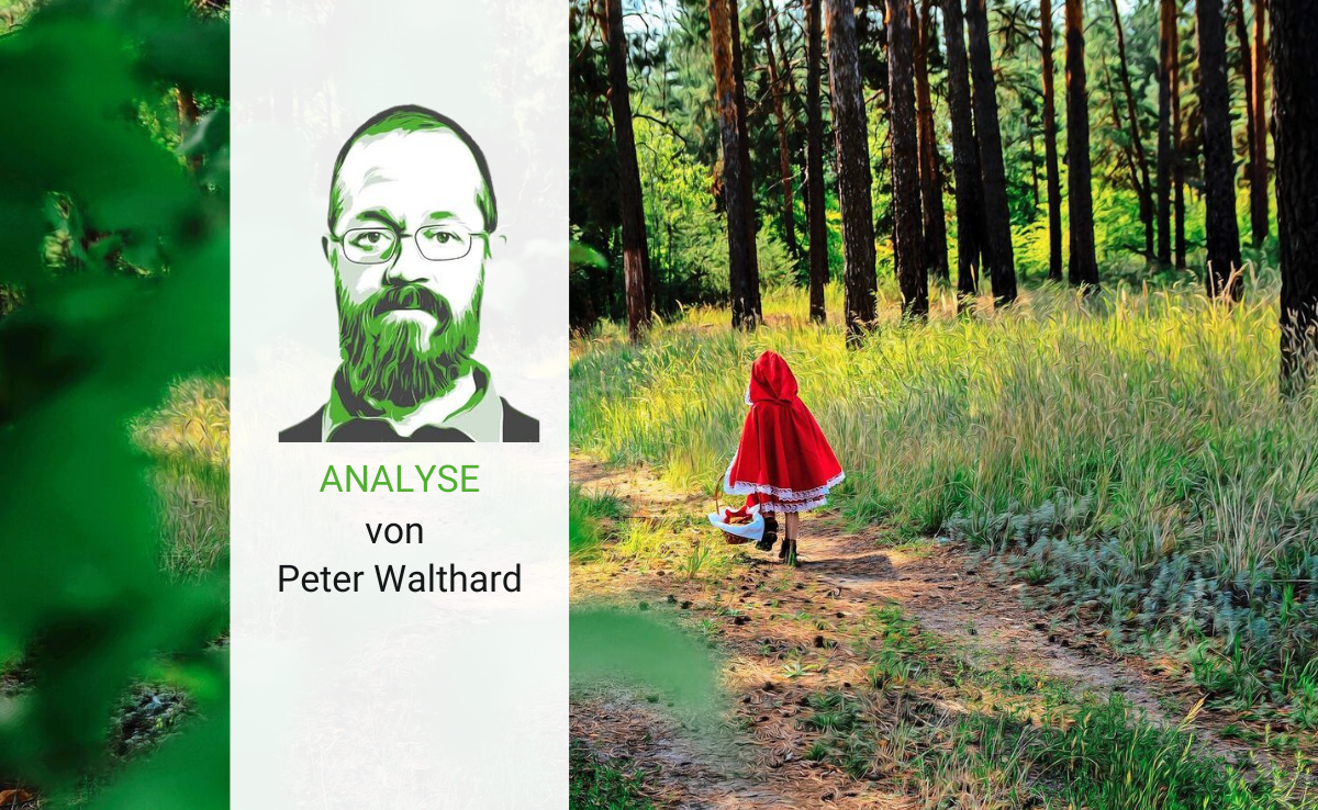 «Rotkäppchen» fällt in der Wolfsdebatte immer dann, wenn Gegner des per EU-Gesetz verordneten Anwesenheitsrecht des Wolfes in seinem natürlichen Verbreitungsgebiet – das ist nach offizieller Auslegung einfach überall dort, wo er eben gerade ist – als rückständig und fortschrittsfeindlich dargestellt werden sollen. In den Kindergärten des Landes wird das Märchen meist nicht mehr vorgelesen – zu brutal ist es den Pädagoginnen. Es erzählt die Geschichte von der grossen Angst vor dem finsteren Wald und dem kleinen Mädchen, das diese überwindet, um der lieben Grossmutter nahe zu sein. Bemerkenswert: Rotkäppchen darf alleine in den Wald.