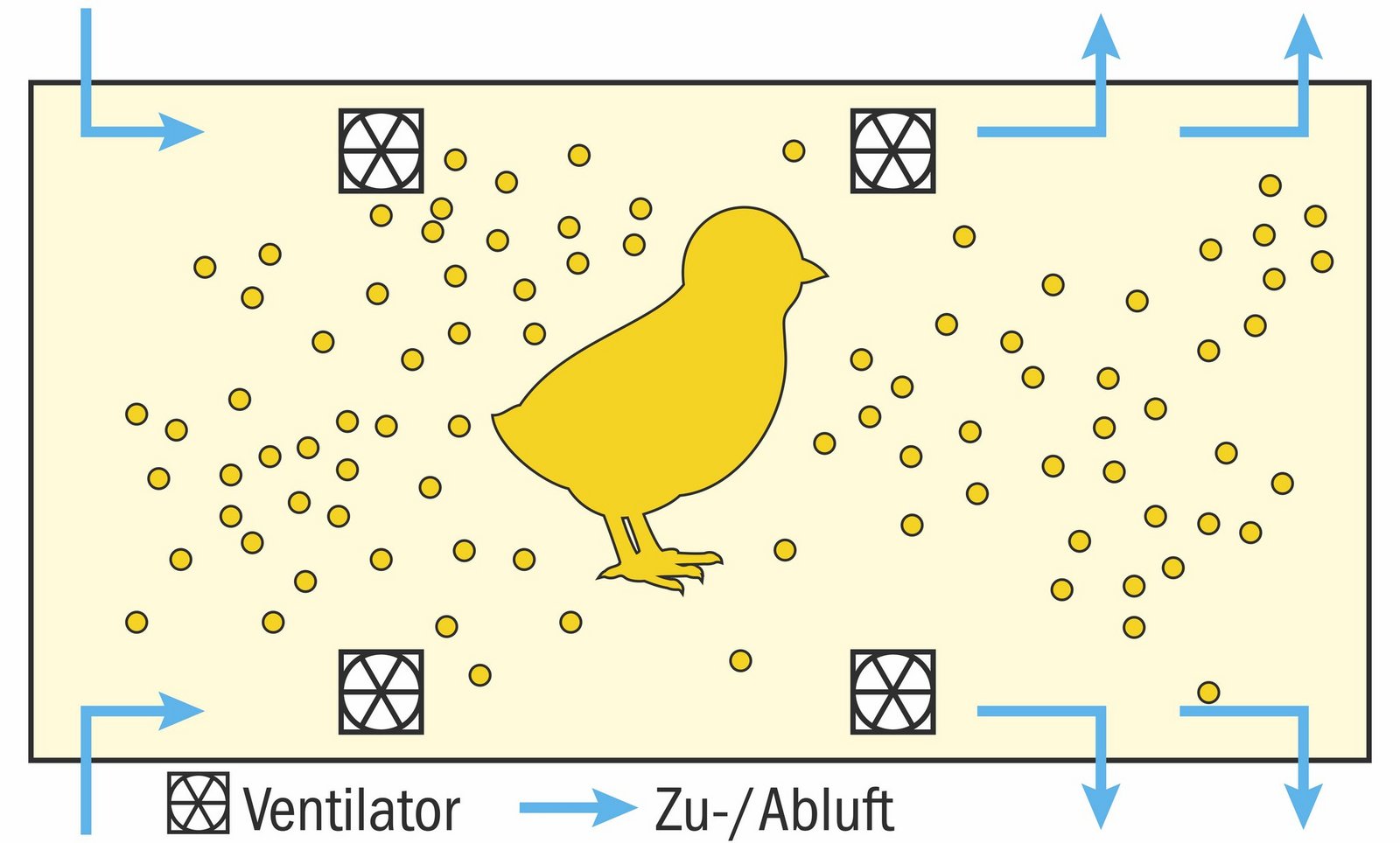Einen kühlenden Effekt kann auch eine ausreichend hohe Luftgeschwindigkeit erzeugen. Der Luftstrom sollte dabei direkt auf Tierhöhe ausgerichtet sein, um die von den Tieren produzierte Wärme abzutransportieren. Eine hohe Luftgeschwindigkeit wird erzeugt, indem man die maximale Leistung der Ventilatoren ausnutzt. Auch Grossraum- oder Umluftventilatoren im Stallvorraum bzw. beim Stalleingang sorgen für eine höhere Luftgeschwindigkeit. Diese sollten aber so platziert werden, dass sie die Luft von der kühleren Seite des Stalls ansaugen – ein Standortwechsel im Laufe des Tages ist wegen wechselnder Besonnung angebracht.