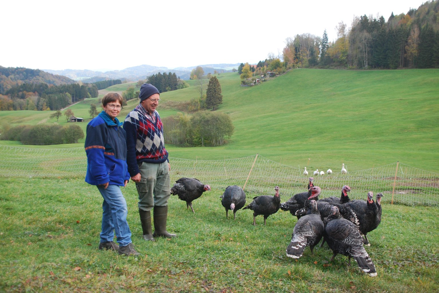 Der Hof Bärlischwand der Familie Feuz liegt idyllisch zwischen sanften Hügeln, näher dem Weiler Sitzberg als dem Dorf Bichelsee auf über 800 Meter über Meer. Die Tiere mit den schrumpeligen Hautlappen über dem Schnabel und dem Hals mit den geschwürartigen Verwucherungen sind nicht unbedingt eine Augenweide und man verliebt sich eher in ein herziges Kaninchen, ein rosarotes Ferkel mit Knopfaugen oder in eine stolze Diepoldsauergans, die sich ebenfalls rund um den Hof Bärlischwand tummeln, als in einen Truthahn.