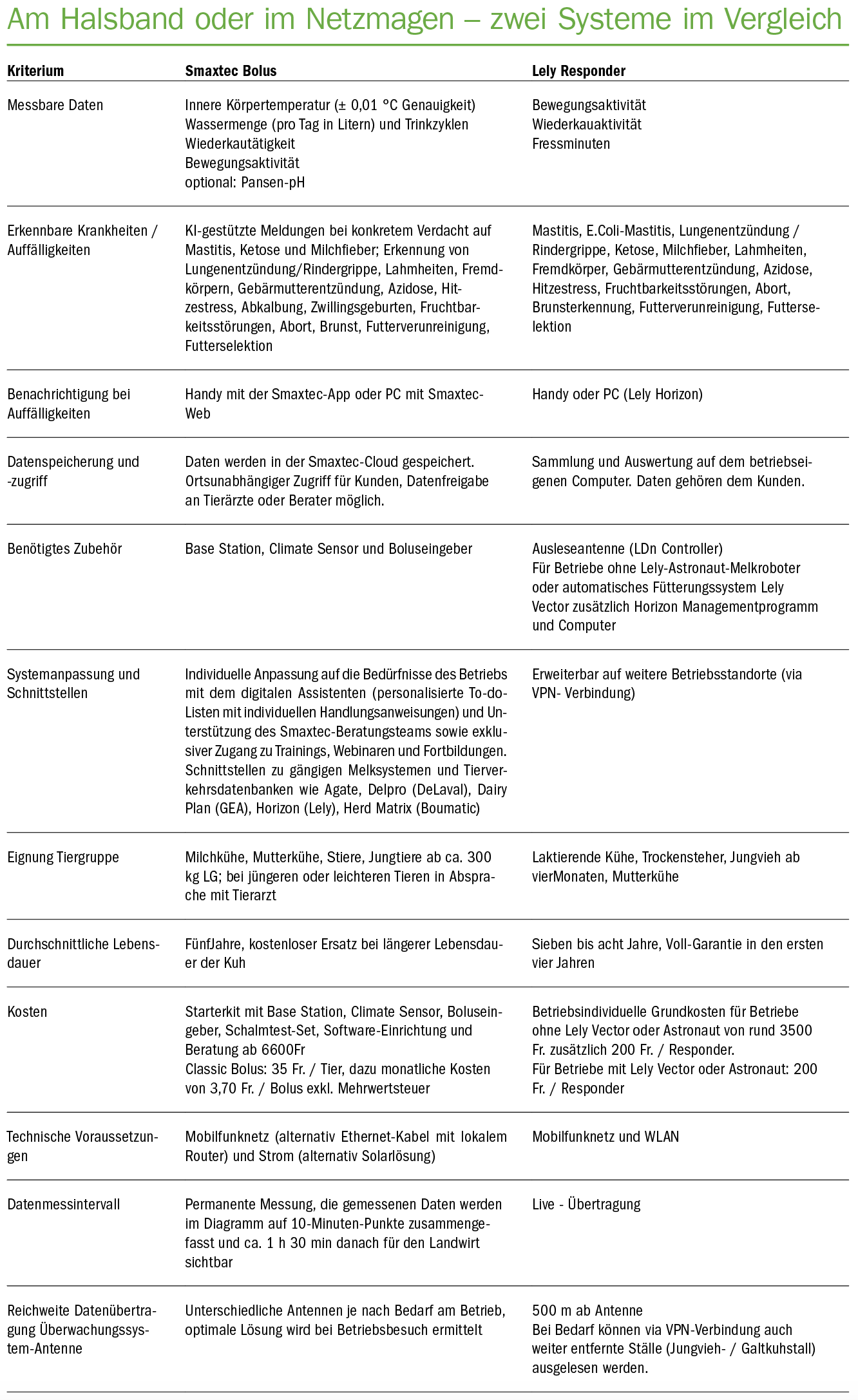 Die meisten Systeme basieren auf einem Beschleunigungssensor, der das Bewegungsverhalten und die Bewegungsintensität erfasst. Mit Hilfe von Algorithmen und vermehrt auch mit KI werden die Bewegungsmuster mit Sollwerten verglichen und daraus dann Vorhersagewahrscheinlichkeiten für Brunst, Abkalben, Lahmheit oder auch Stoffwechselkrankheiten abgeleitet. Die Trefferquote wird dabei mit zunehmender Zeit immer besser und der Landwirt hat ein gutes Entscheidungshilfsmittel. Vor allem aber helfen die Systeme bei der Tierbeobachtung, da sie Auffälligkeiten schnell bemerken. Fortschrittlichere Systeme wie z.B. Smaxtec haben neben dem Beschleunigungssensor auch noch einen Temperatursensor integriert. Mit diesem kann dann die Körpertemperatur oder auch die Wasseraufnahme überwacht werden. Und zum ersten Mal besteht eine unmittelbare Erfolgskontrolle der getroffenen Massnahmen.[IMG 5]
