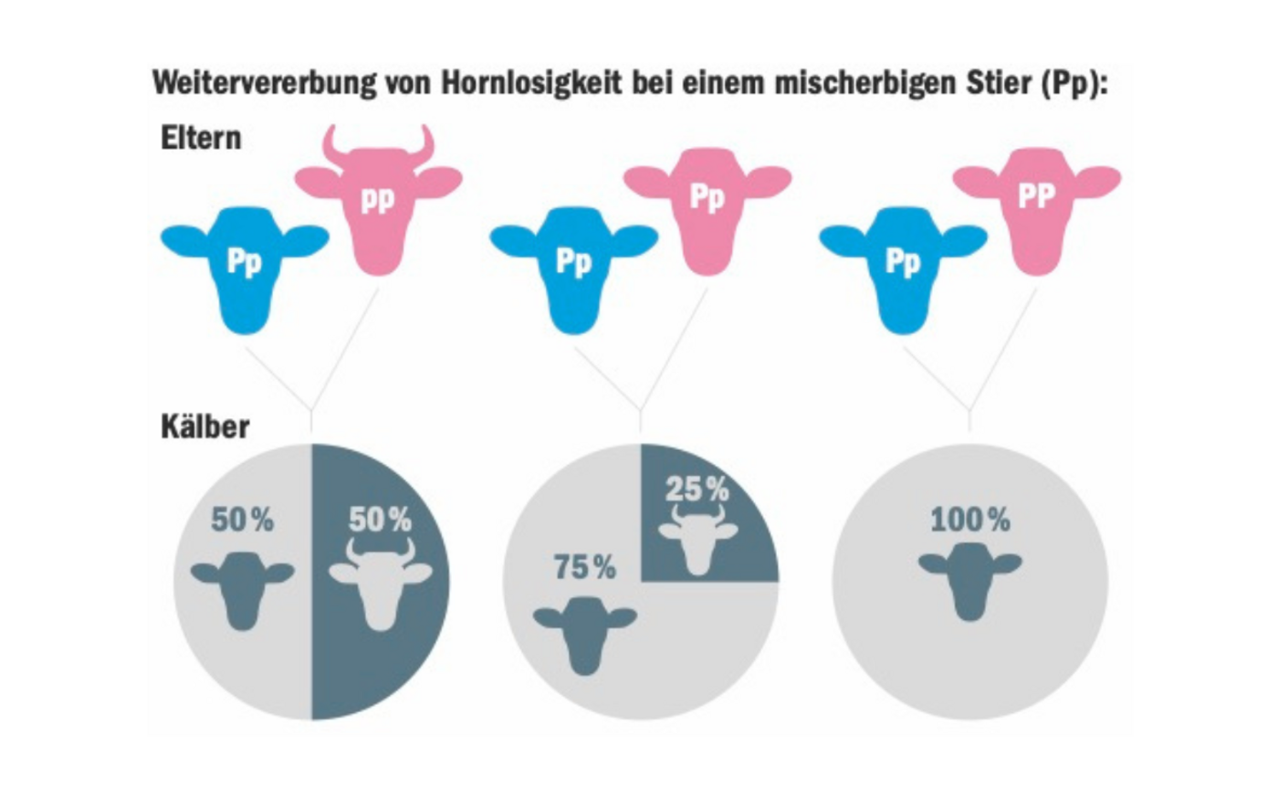 Die Kälber reinerbiger Stiere sind immer hornlos. Ist der Stier nur mischerbig, kommt es auf die Kuh an, ob die Nachkommen hornlos oder horntragend sind, wie in der Grafik ersichtlich ist.