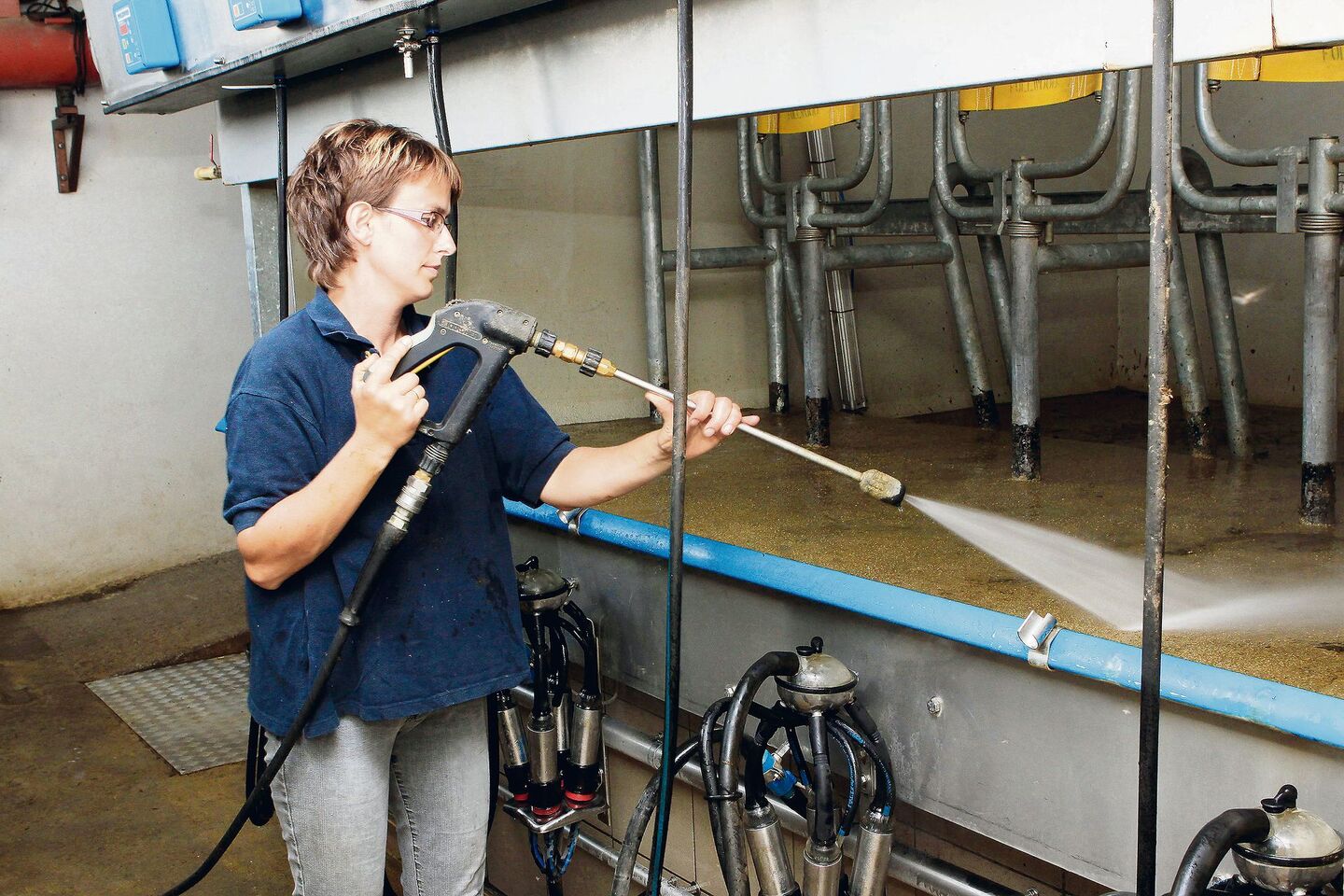 Auch rund um den Melkbereich ist die Hygiene zentral. Ein sauberer Melkstand oder Melkroboter sind für die Lebensmittelproduktion unabdingbar. Bezüglich Wasserverbrauch und Arbeitsaufwand lohnt sich in diesem Bereich die Installation einer festinstallierten Hochdruckpumpe mit Hochdruckschlauch für den täglichen Gebrauch.