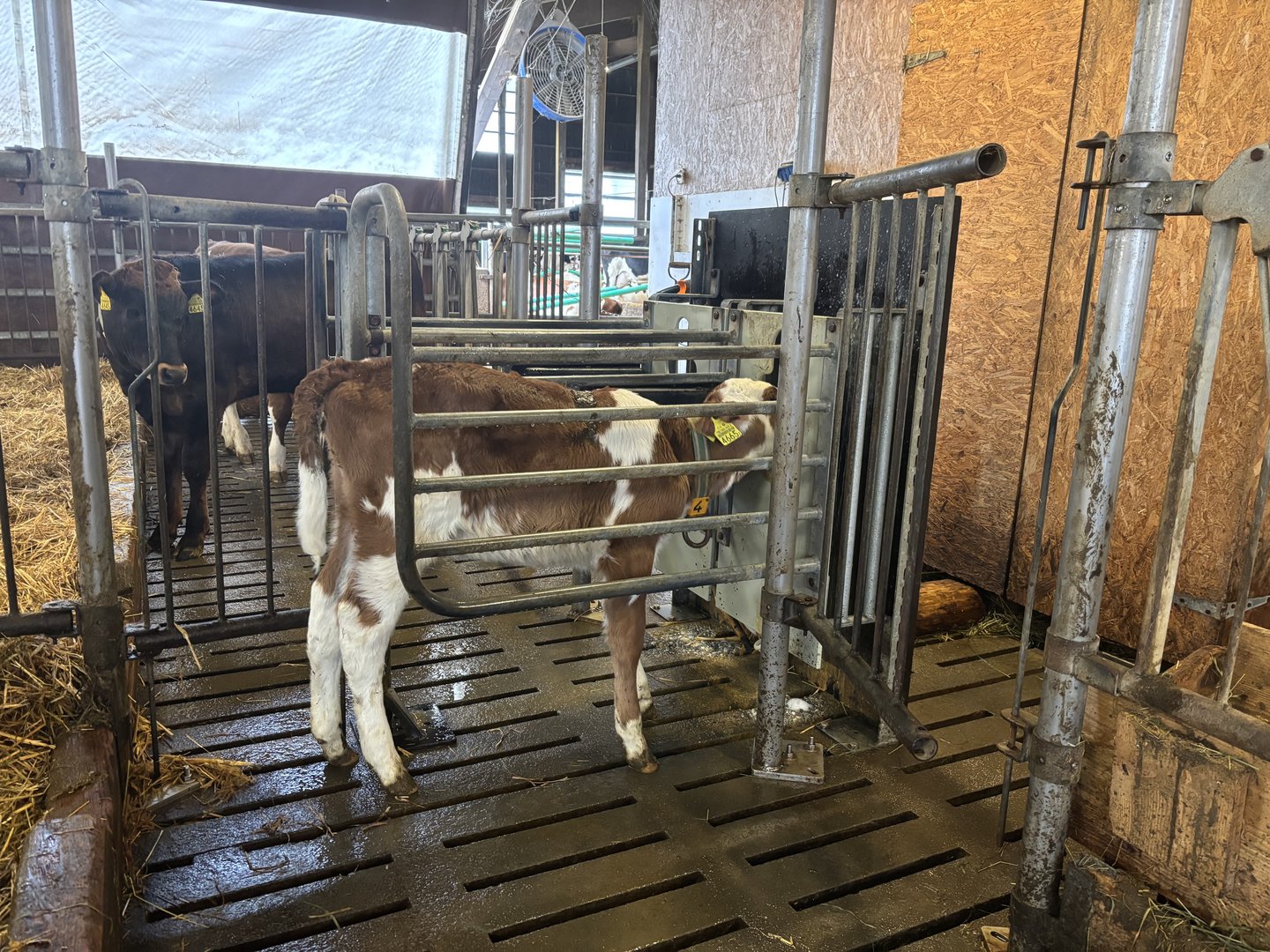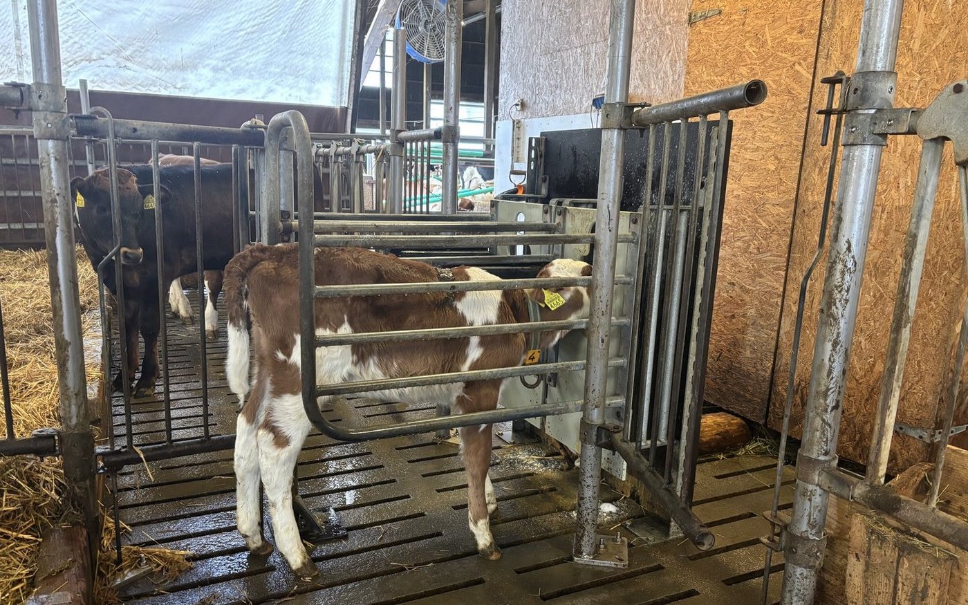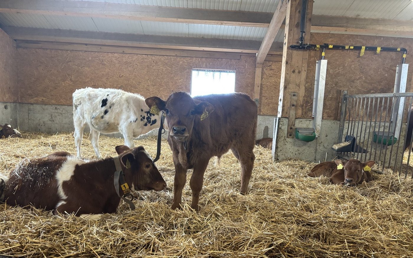 Nach der Geburt bleiben die Kälber den ersten Tag bei der Mutter in der Abkalbebox. Das Kolostrum nehmen die Jungtiere in den meisten Fällen direkt vom Euter. Das hat für den Landwirt nicht nur Vorteile. «Meistens wollen sie beim ersten Mal nicht aus dem Kessel saufen – beim zweiten Mal klappt es dann aber meistens», erklärt er.