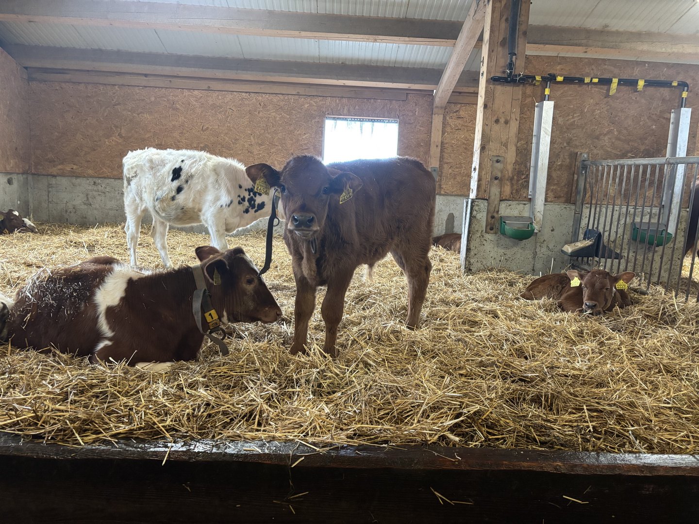 Nach der Einzelhaltung kommen die Kälber in den Gruppenstall. Dieser ist in zwei Tiefstreubuchten mit Fressachse und Auslauf unterteilt. Zu Beginn werden die Mast- und Aufzuchttiere gemeinsam gehalten und erhalten neben Heu auch die Futtermischung der Kühe. «Wir hatten anstelle der Mischung auch schon Kälbermüesli. Damit haben wir auch gute Erfahrungen gemacht, arbeitstechnisch haben wir uns aber für die Mischung der Kühe entschieden», erklärt er.