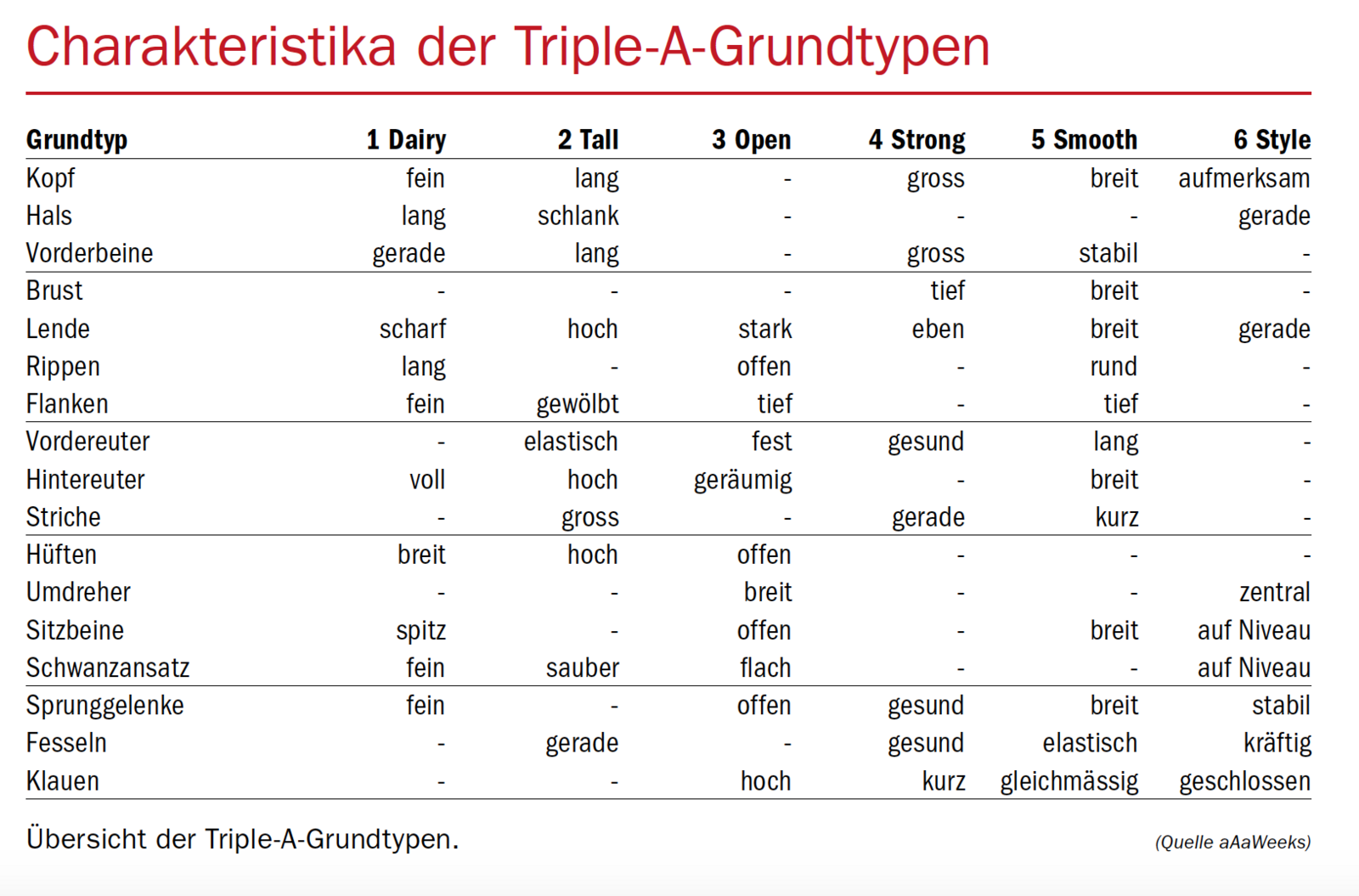Bei aAa (Animal Analysis Associates) begutachten geschulte Analysten die Kühe nach ihrer Form. Es gibt sechs Körperbaumuster, die dem Körper eine bestimmte Form geben. Diese Form ermöglicht dem Tier, bestimmte Funktionen gut ausführen zu können.