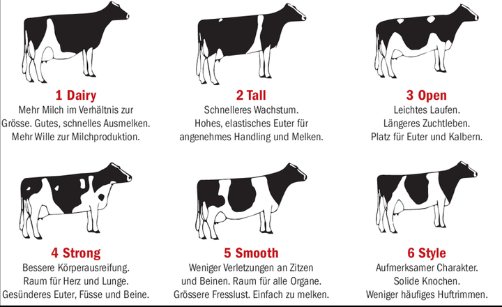 - einen tiefen Brustkorb, damit das Herz gross genug ent-wickelt ist, was eine höhere Durchblutung bzw. Gesundheit des Euters, Gelenke und Klauen ermöglicht,