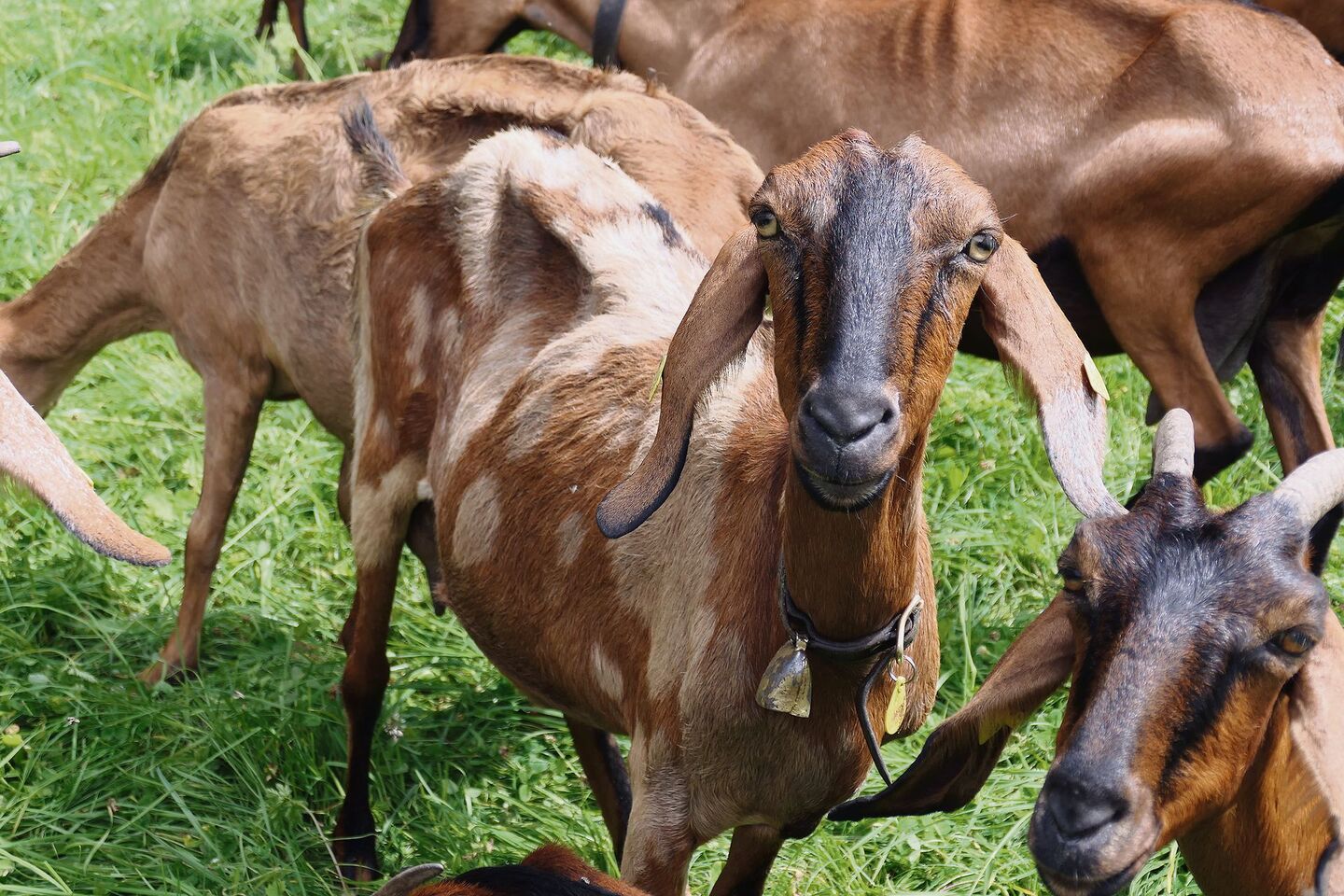 Mit dem Betrieb hat die Familie auch eine Herde von rund 60 Milchziegen übernommen. Diese besteht vor allem aus zwei Rassen, der Anglo-Nubischen Ziege sowie der Gämsfarbigen Gebirgsziege. Während es sich bei letzterer um die häufigste Schweizer Geiss handelt, ist die Anglo-Nubische Ziege eine hierzulande seltene Rasse. Sie ist ursprünglich aus englischen und afrikanischen Landschlägen entstanden. Die Tiere sind mehrheitlich braun mit hellen Flecken, typisch sind zudem die hängenden Ohren und die Ramsnase. «Anglo-Nubier weisen einen besonders guten Milchgehalt auf, die Milchleistung ist jedoch eher bescheiden», stellt Simone Burki fest. Um diese zu verbessern, halten sie einen reinrassigen Gämsfarbigen Ziegenbock, während zur Förderung der Fleischleistung ein Ziegenburenbock die Herde aufmischt.