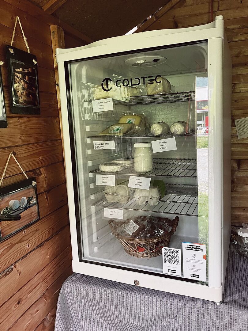 Die Käserei mit dem 350-Liter-Kupferkessi ist das Metier von Simone Burki. Hier verbringt sie die Vormittage abwechselnd damit, Ziegen- und Kuhmilch zu verarbeiten. Aus der Milch ihrer Ziegen, an einem Tag kommen etwa 80 Liter zusammen, entsteht eine ganze Palette von Produkten: der Halbhartkäse «Fryberg», ein Schimmel-Weichkäse, Frischkäse, Quark, Joghurtdrink sowie verschiedene Sorten Glace. 2021 wurden 9324 kg Milch für den Frybergkäse verkäst und 1925 kg Milch für Frischprodukte.