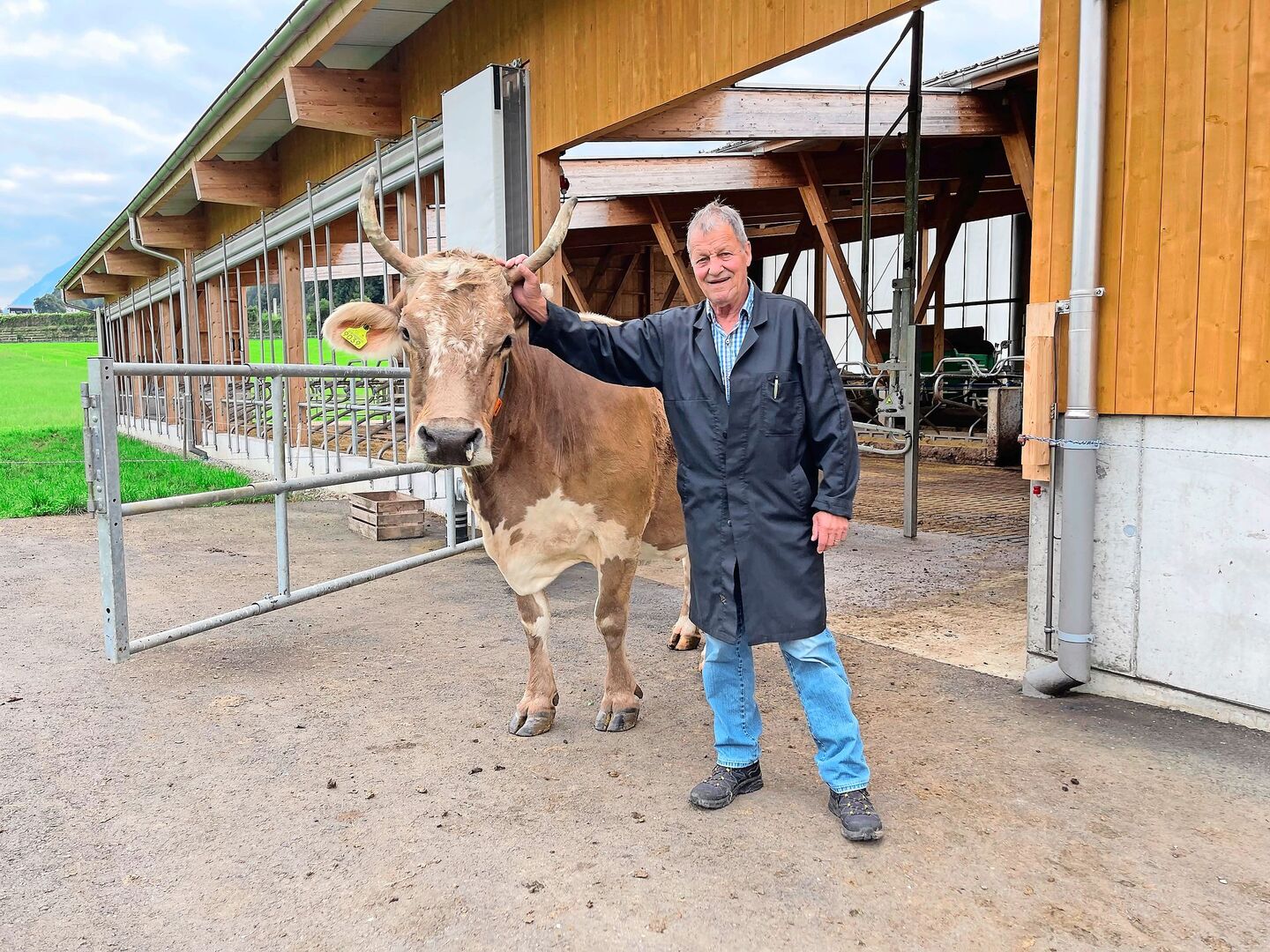 Freude hat er auch am neuen Laufstall. Die Kühe haben freien Zugang zur Weide. Zumstein beobachtet, wann es diese nach draussen zieht. Manchmal bei grösster Hitze, erstaunlicherweise. Die OB-Kühe der Familie Zumstein sind ausnahmslos behornt. Eine Herzensangelegenheit für den Viehhändler. Dass der Nachfolger das auch so sieht, freut ihn. Es sei ein heikles Thema. Natürlich habe er immer Vieh mit und ohne Horn gehandelt. Für ihn sei der Fall aber klar: Der Natur sollte man hier nicht ins Handwerk pfuschen. Hornkühe brauchten im Laufstall sicherlich mehr Platz, dann funktioniere das problemlos. Und problemlos war auch seine Lieblingskuh. «Blüem», der Name ist Programm (siehe Bild), hat er vor rund zehn Jahren auf dem Viehmarkt Urnerboden gekauft. Auch diesen gibt es heute nicht mehr. Blüem habe einen Charakter, genauso wie er es mag. Ruhig gegenüber dem Tierhalter, aber mit dem nötigen Stolz innerhalb der Herde. Am Montag, einen Tag nach ihrem zehnten Kalb, trottet sie gemütlich ins Freie und stellt sich neben Willy Zumstein zum Fototermin. Es ist das letzte Bild von ihr, am Dienstag hatte sie einen Herzstillstand.