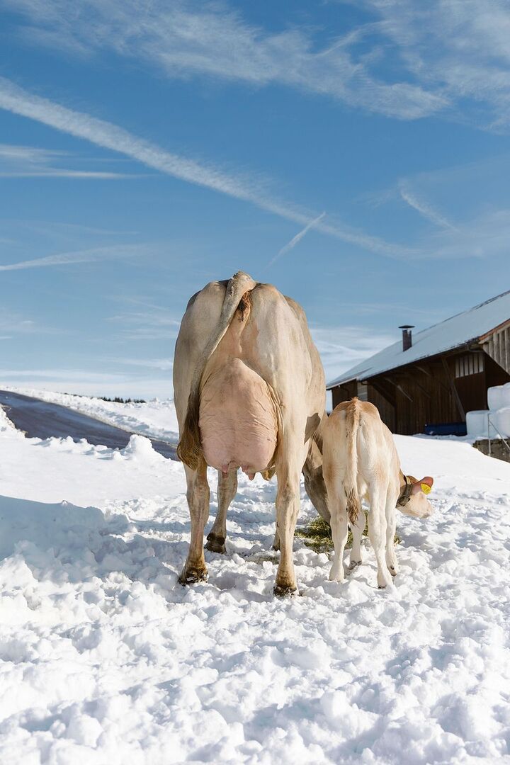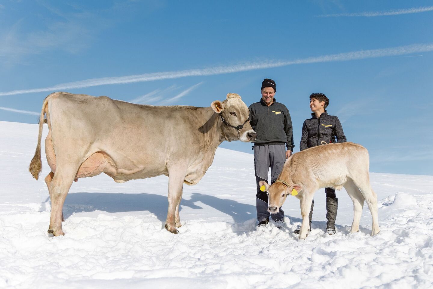 Inzwischen stapft auch Pinias jüngster Nachwuchs Pinora durch den Schnee. Es ist der erste Freigang für das rund einen Monat alte Kuhkälbchen. Seine jüngere Schwester Pinella wird am 23. Februar an der IGBS-Auktion versteigert.
