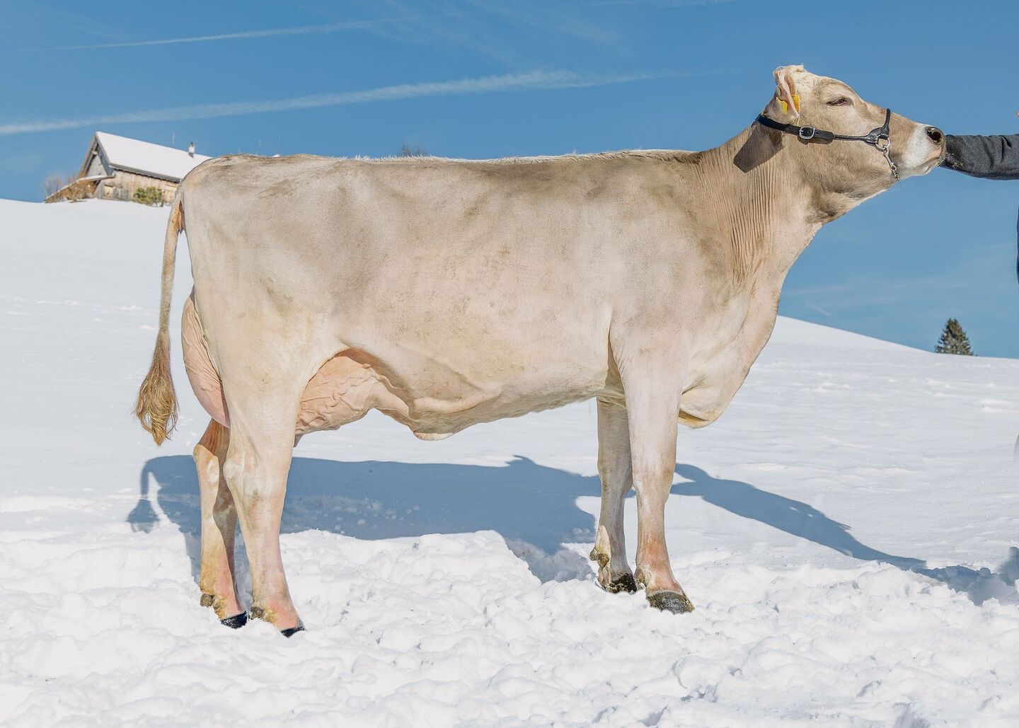 Ruhig lässt sich Pinia über den Hofplatz und durch den Schnee führen. Sie ist sich den Gang am Halfter und das Posieren für die Fotografin gewohnt. Die am 28. Juli 2019 geborene Brown-Swiss-Kuh kommt aus einer starken Zuchtlinie. Sowohl ihre Mutter, Riethof's Blooming Bersina, als auch die Grossmutter, Ammann's BS Jongleur Roswita, waren exzellent beschriebene und leistungsstarke Kühe. Bisher gab es aus Pinia, Bersina und Roswita je fünf Kälber. Von diesen 15 Nachkommen waren 14 weiblich.