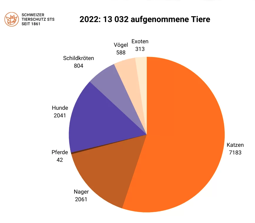 - Katzen wurden letztes Jahr insgesamt 7183 aufgenommen (2021: 7724). Mit 301 Katzen ist die Anzahl Tiere aus amtlichen Beschlagnahmungen gestiegen (2021: 247).