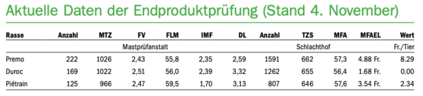 Mit dem Einsatz von mehr farbigen Ebern nehmen die Betriebe dafür aber andere Schwächen in Kauf. Betrachtet man die aktuell veröffentlichte Endproduktprüfung (Stand 4. November) der Suisag, so zeigen die Mastschweine der drei Vaterrassen unterschiedliche Stärken und Schwächen. Premo (1026 g) und Duroc (1022 g) zeigen deutlich höhere Masttageszunahmen als Piétrain (966 g).